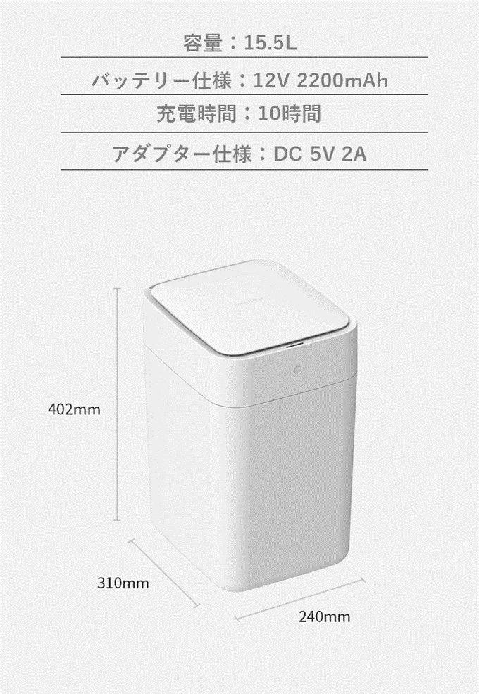2020/08/29 00:27TOWNEW動作確認作業商品到着後まず充電を行ってください!※充電状況の確認方法は本体内部のLEDライトで判断可能です。充電中はLEDライトが点滅し、充電完了するとLEDライトの点滅が止まります。充電がなければないほどゆっくり点滅します。充電完了後、もしくは充電を行いながら下記の内容に沿って動作確認をお願い致します。①充電完了後、もしくは充電を行っている状態で本体背部の電源スイッチをオンにします。②最初に確認するのは自動開閉機能についてです。本体上部の正面部に黒い赤外線センサー部分があります。感知範囲はセンサーから上部約35cmとなっており、範囲内に物を感知すると自動で蓋が開きます。範囲内から物が無くなると約2秒後に自動で蓋が閉まります。ゴミ箱内部に設置されているLEDライトはセンサーが感知している間は点灯しており、感知範囲から物が無くなると徐々に消灯していきます。③続いてオープンモード機能の確認です。本体正面部のボタンを1回押します。※長押しではなくワンタップです!ボタンを押すと「ピッ」という音が鳴り、オープンモードに切り替わります。※この時「ピッピッピッピッピッピッ」と複数回ビープ音が鳴った場合は充電不足ですのですぐに充電を行ってください。もう一度本体正面部のボタンを押すとオープンモードは解除され、赤外線センサーによる自動開閉モードへ切り替わります。④続いてゴミ袋のセットについてです。通常はゴミ袋の梱包から次のゴミ袋のセットまでが一連の流れとなりますが、今回のように購入して初めての使用の際やゴミ袋カートリッジを取り替えた際は、まず初めにゴミ袋のセットをしなければなりません。セット方法は、本体正面部のボタンを約2秒間長押しするだけです。すると空気排出音がし、完了すると「ピーッピーッピーッ 」という音が鳴りますので赤外線センサー部分に手をかざし蓋を開けて確認してください。ここまでが実際にゴミを捨てるまでにご確認いただきたい動作内容となります。⑤最後にゴミが溜まった後の自動梱包から次のゴミ袋をセットするまでの流れについてご説明いたします。本体正面部のボタンを2秒間長押しをすると「ピッ ピッピッ」という音が鳴り、自動梱包機能が作動します。梱包が完了すると自動で蓋が開き梱包完了をお知らせします。梱包されたゴミ袋を取り出すと、自動で蓋が閉まり、そのまま自動で次のゴミ袋をセットします。トラブルシューティング・ゴミ袋をセットする前に、ゴミ箱内部に物が何もないことを確認してください。万が一、物が入っていると作動しない場合がございますので、取り除いてから行ってください。・本体正面部のボタンを押した際に、「ピッ」と一回なった場合は正常に動いているので、手動で蓋やカバーを開けないようにお願いします。・「ピッピッピッピッピッピッ」と複数回鳴った場合は充電が必要とのアラームになるので、充電を行ってください。 もっと見る