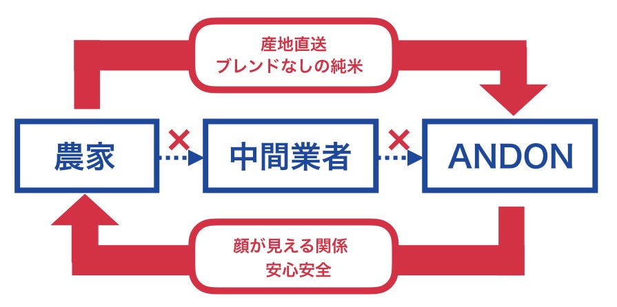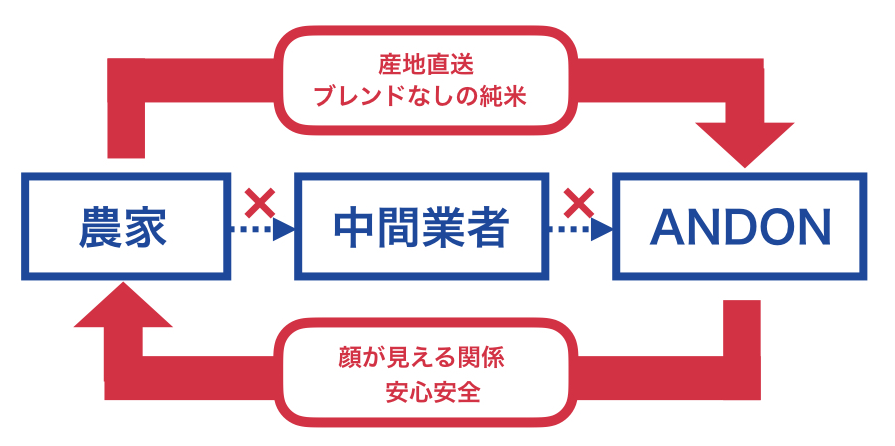 ANDONで扱っているお米は卸問屋などの中間業者を挟まずに、秋田県の米農家から産地直送することで単一農家100%の純米の美味しさと顔が見える安全性を実現していきます。
