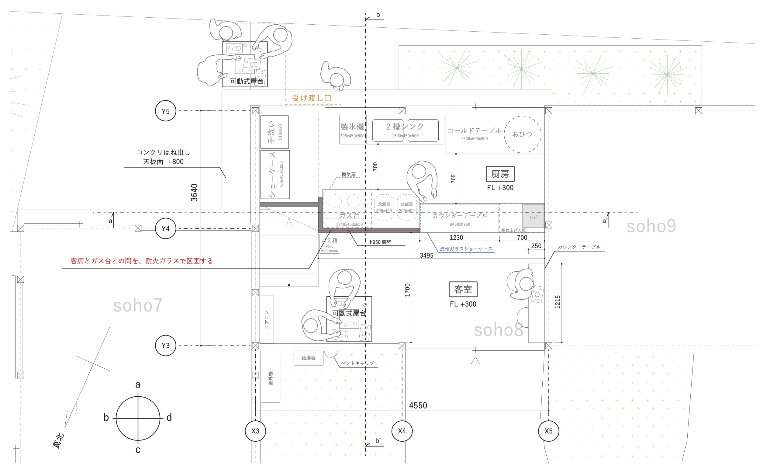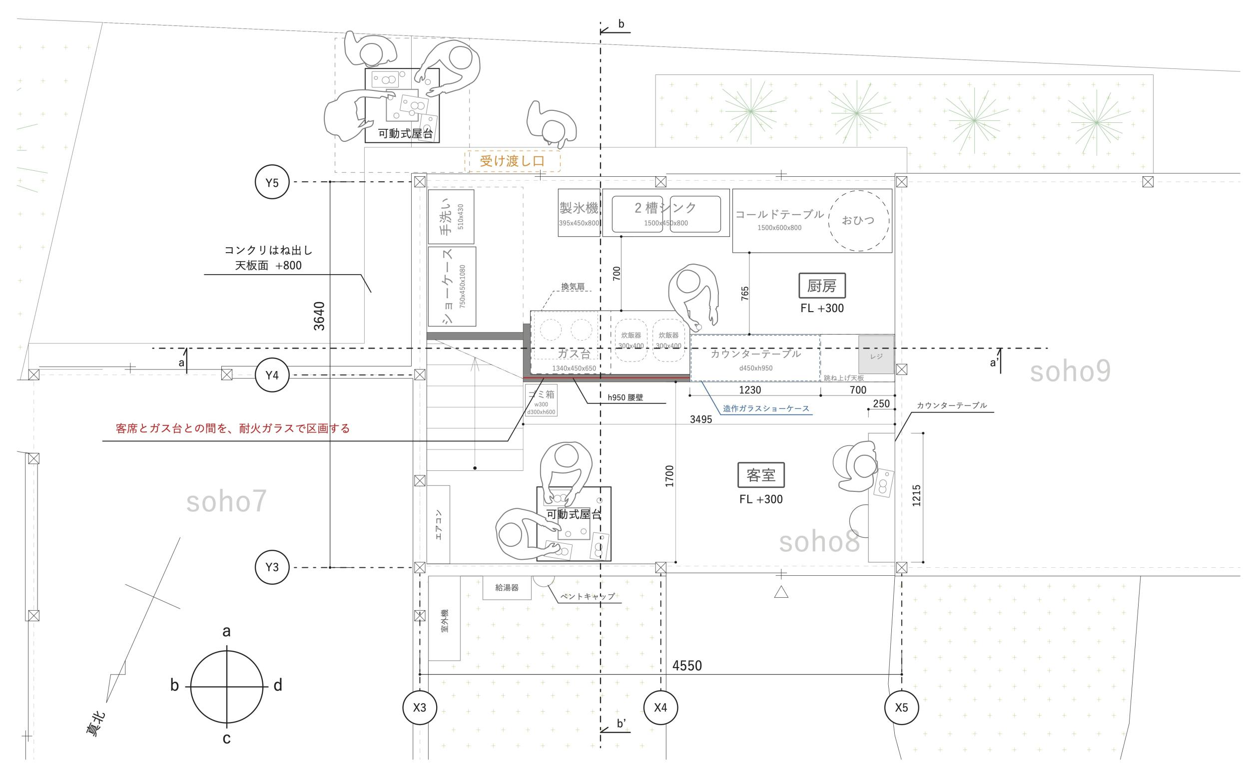 お店の南側には下北沢駅から世田谷代田駅へと繋がる歩道、北側にはBONUS TRACKの広場が広がる正面玄関。お店は南と北の両方からお客様にご注文いただける作りになっています。10坪という広さの中には客席はほんの少し。小さなお店ですが、多くの皆様にお米を楽しんでもらいたい!ということでテイクアウト頑張ります!!