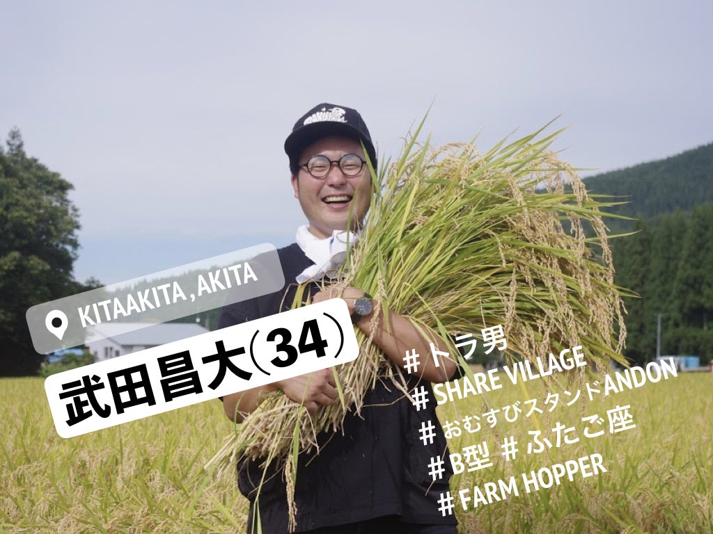 ↑ 武田昌大(たけだまさひろ)1985年5月23日生まれ。立命館大学卒。デジタルコンテンツ業界に従事後、2009年に故郷の農業への危機感を感じ、2010年秋田の若手農家集団トラ男(トラクターに乗る男前)結成。2011年起業。2015年、年貢を納めて村民に!シェアビレッジプロジェクトを立ち上げ村長に。2017年、東京都日本橋におむすびスタンドANDONをオープン。