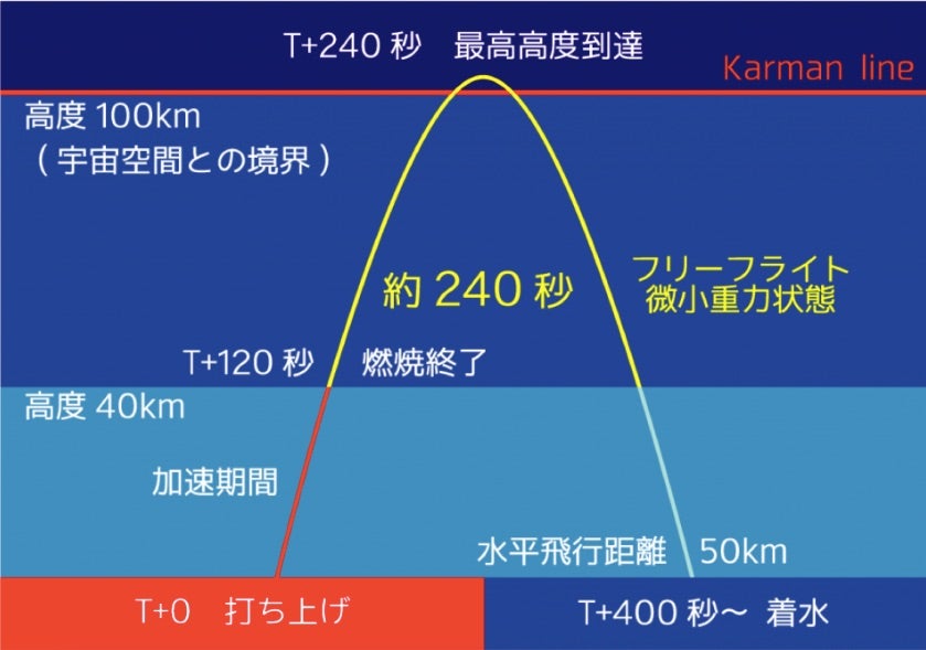 そもそも観測ロケットMOMOは、地上から約120秒間エンジンを燃焼させ加速する期間を経て、高度100kmまで上昇したあと、微小重力状態を経て海に着水するロケットです。エンジンが停止してから高度100kmに到達し、さらには高度40kmまで落ちていく間の約240秒間が微小重力空間で様々な実験や測定が可能となります。