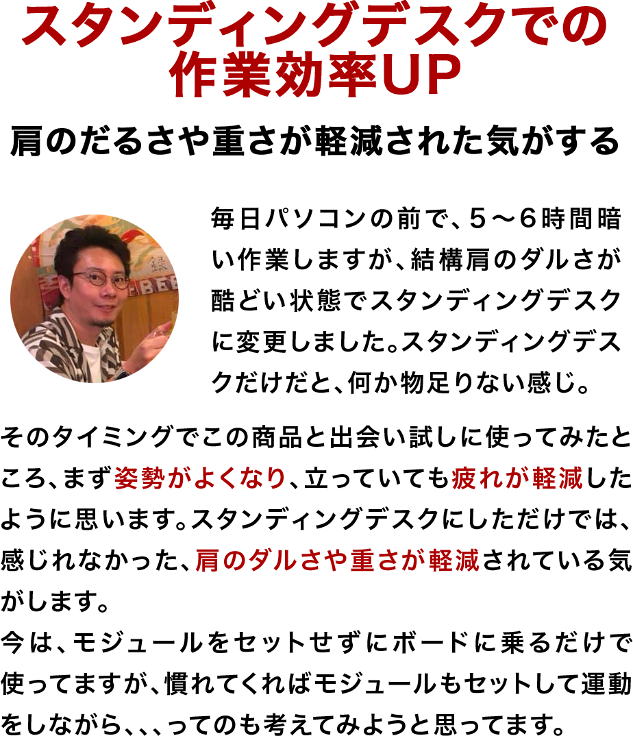 それにより仕事の効率アップをサポートし、同時に体のメンテナンスを行うことができます。