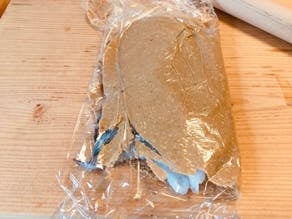 2. ぬかを2枚のラップで挟み、麺棒で薄く伸ばす。