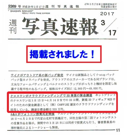 2017年3月17日発行の写真業界紙「週刊写真速報」に弊社クラウドファンディングの記事が掲載されましたことをお知らせいたします。