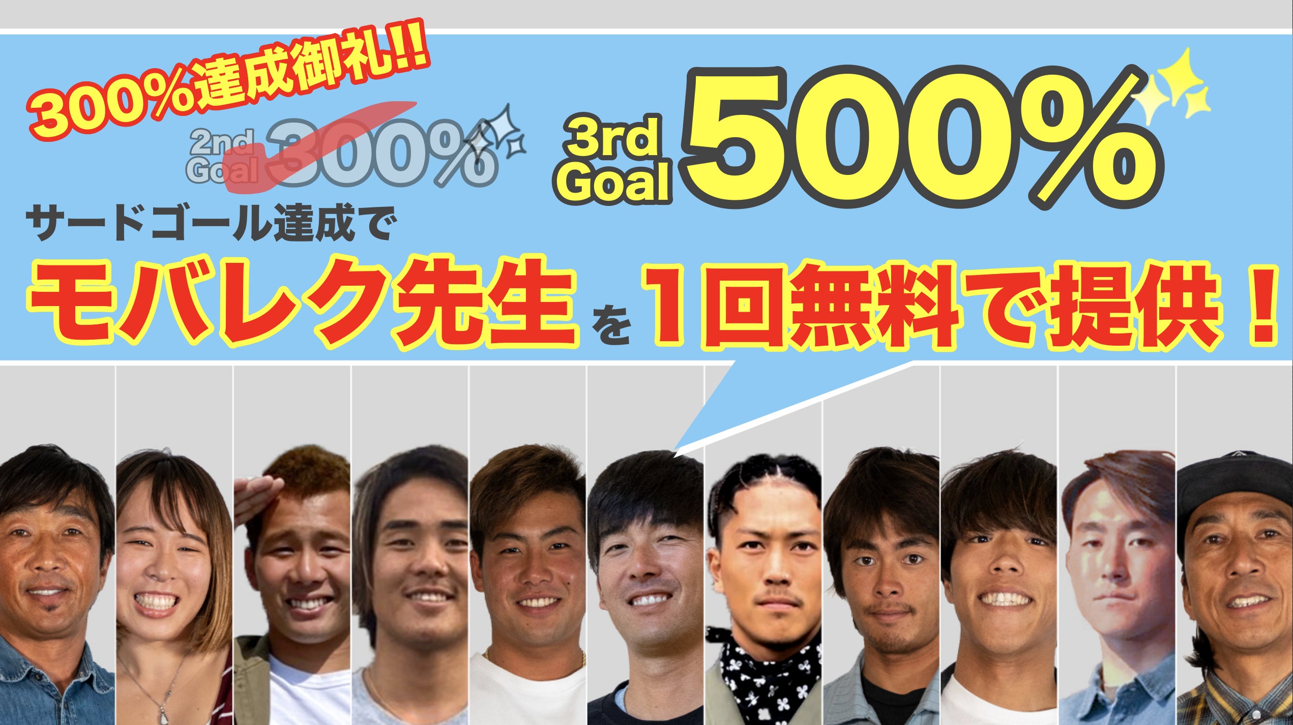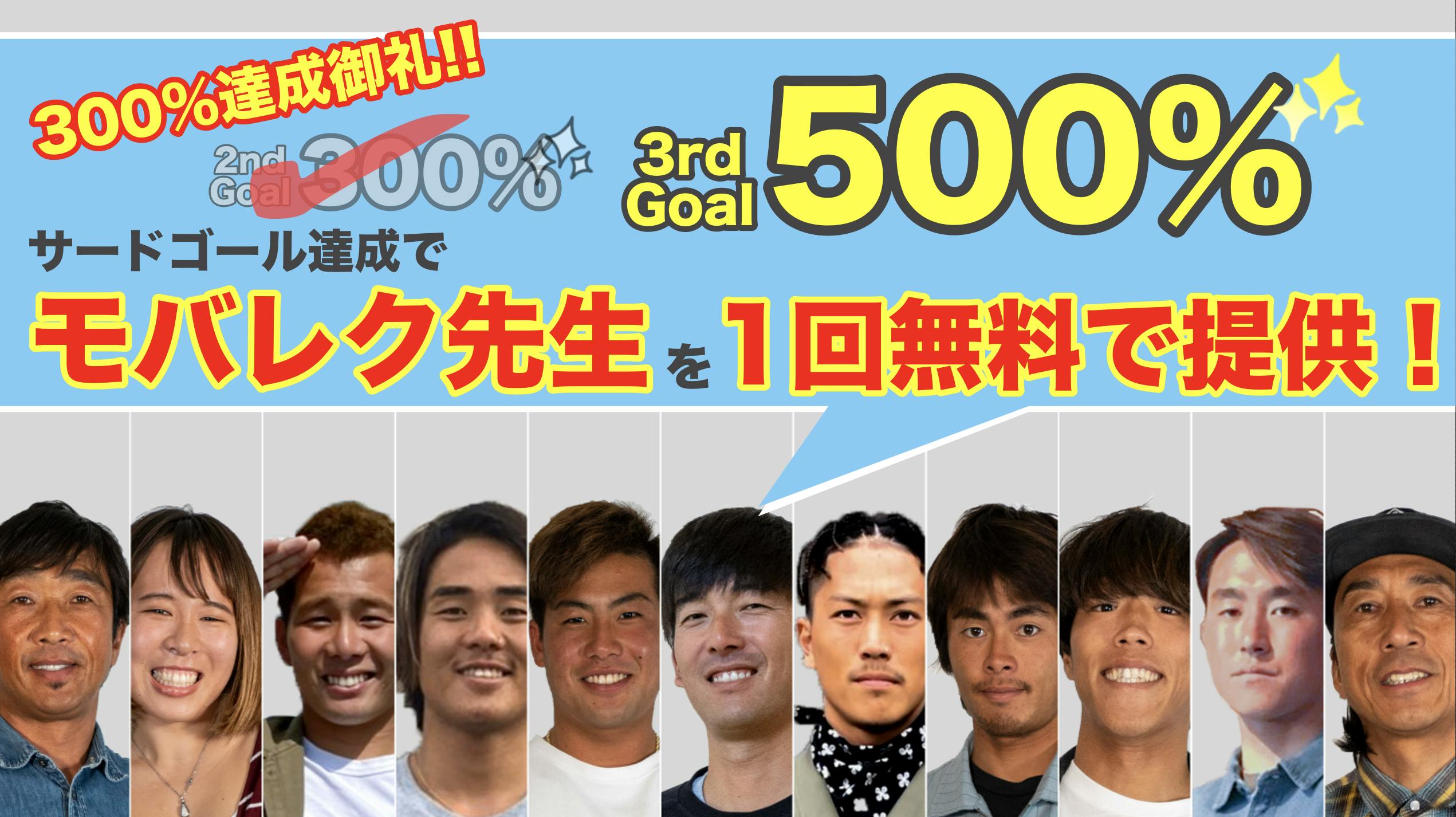 2020/05/26 17:32御礼【モバレク】をご支援いただいている皆さま、興味を持っていただいている皆さま。たくさんの応援をどうもありがとうございます!!おかげさまで、セカンドゴールとして設定した、目標金額の300%を達成することができました!モバレクチーム一同、感謝御礼申し上げます。ありがとうございます!!今日は5月25日。モバレクのクラウドファンディングも残り5日となりましたが、より多くの方にモバレクを使っていただき「日本サーフィンを底上げする!」というビジョンに近づくために、ぜひ最後までクラウドファンディングを応援お願いいたします!3rd Goal 挑戦中!モバレクのクラウドファンディングはセカンドゴールを達成し、現在サードゴールに挑戦中です!サードゴールは目標金額の500%を達成すること!この目標を達成できた暁には、このモバレクのクラウドファンディングを支援してくださった方にライディング動画添削サービス『モバレク先生』を1回無料でご提供※させていただきます!!!(4,000〜10,000円相当)※モバレクの有料会員にご登録いただけるリターン(④〜⑧)をご選択いただいた方の割引率です。リターン①〜③をご選択いただいた方には、目標金額300%達成で30%引き、目標金額500%達成で半額とさせていただきます。モバレクアプリの教科書動画で学んでもらって、練習してみたけど自分ではなんで失敗してしまうのか分からない…アドバイスがほしい!…というときに『モバレク先生』の出番です!ぜひ今回のクラウドファンディングでモバレクに参加していただき、モバレクのフルサービスを体感していただきたいと思います!『モバレク先生』の詳しいサービス内容についてはクラウドファンディング本文中の説明をご覧ください。こちらは『モバレク先生』のイメージ動画です!モバレクのクラウドファンディングは5月30日の23時59分59秒をもって終了します。5月31日ではないのでご注意ください!▼最後にここで本文の「最後に」の部分を抜粋させていただきます。我々モバレクの想いは変わらず!より良い日本のサーフィンの未来のために邁進してまいります!私たちの目指すビジョンは大きく言えば「日本サーフィンの底上げ」。そのためにも「今日のあなたのサーフィンがどれだけ楽しいか」が一番重要だと思っています。「サーフィン楽しい!!」と心の底から思える人がもっともっと増えてほしい!そして日本中の海に笑顔が溢れたら…こんな幸せなことはありません。モバレクはそのために尽力して参りますので、今回のクラウドファンディングにもどうぞお力添えの程よろしくお願いいたします。モバレクチーム一同 もっと見る