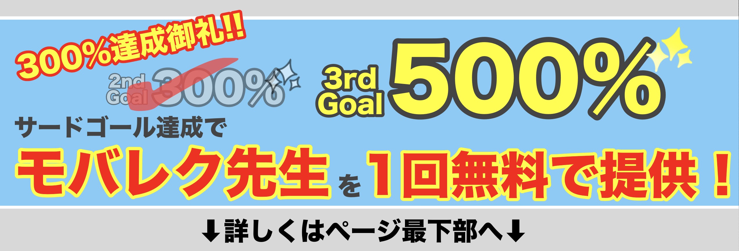 目標金額300%達成御礼!サードゴール500%達成で『モバレク先生』を1回無料でご提供させていただきます!