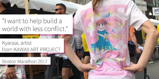 昨年の「FROM KAWAII ART 展」を機に運営メンバーとして団体を支えてくれているエミリーのボストンマラソン2017出場にともない”KAWAII ARTのもつ豊かさや平和を願う心を人々に伝える”ため、オリジナルのランニングTシャツをアーティストのきゃらあい氏とコラボ制作しました。