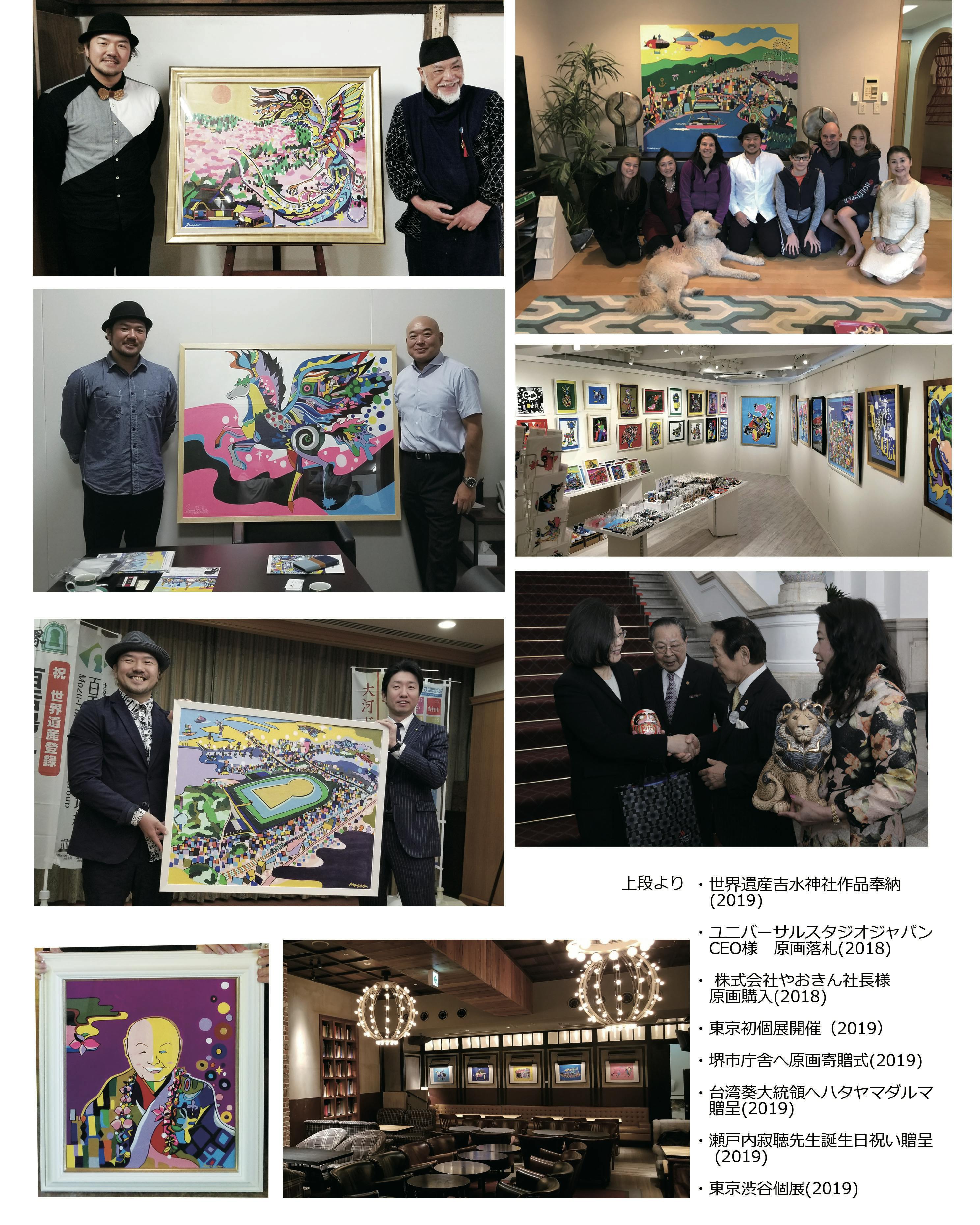 作品がUSJのCEOや台湾の大統領の手に渡ったり、世界遺産吉水神社への奉納や世界遺産百舌鳥古墳群の堺市庁舎へ寄贈、2025年大阪万博協会に寄贈展示されるなど多岐に渡る活動をしています