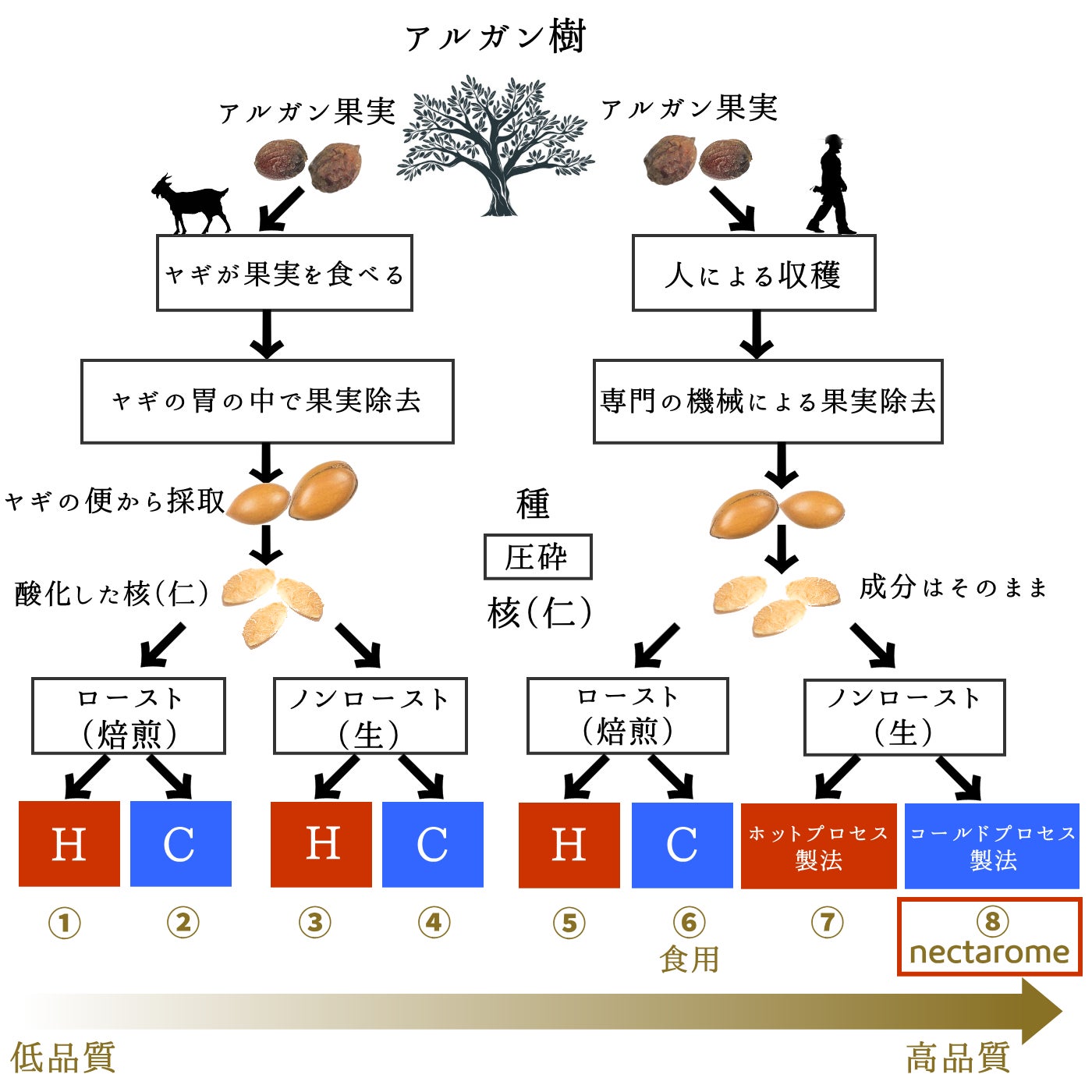 ネクタローム創業者でありマラケシュ大学で教鞭を振るう Dr.ベルカメルが提唱するアルガンオイルの新品質基準は全8種類の等級があります。