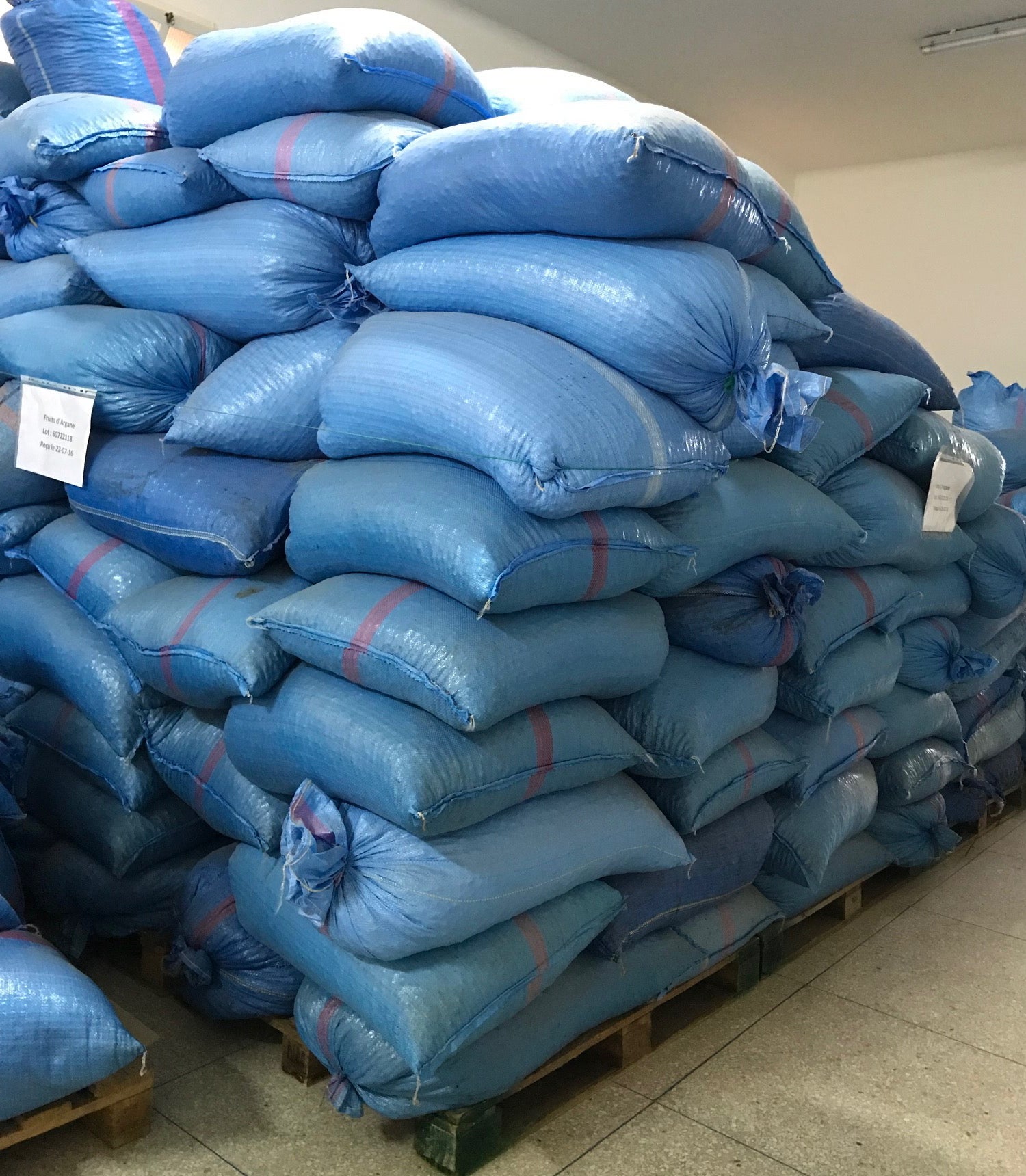 袋には、「ロット番号」「採取された日」が書かれたラベルを貼り付けています。袋は、ロット番号ごとに山積みされ直射日光が当たらない常温の部屋で保管されています。