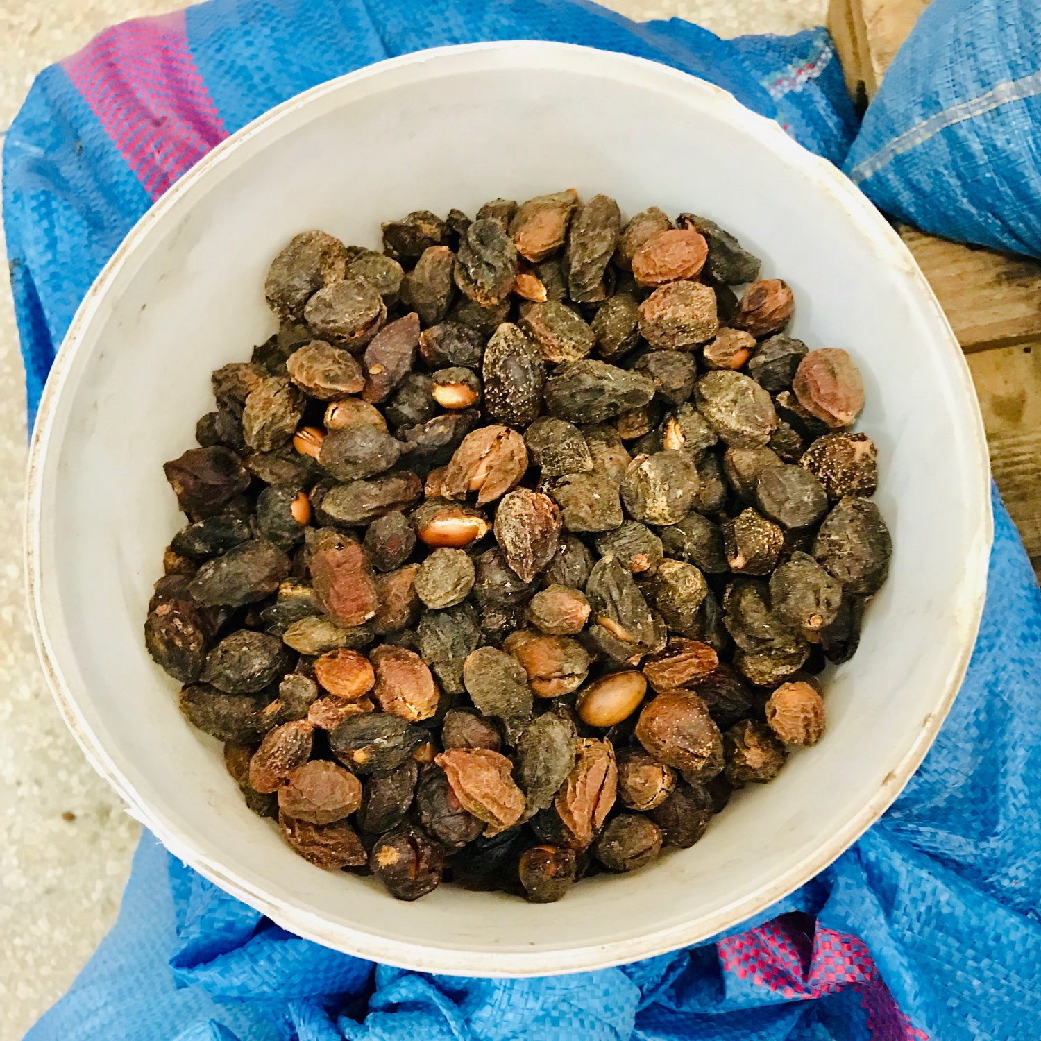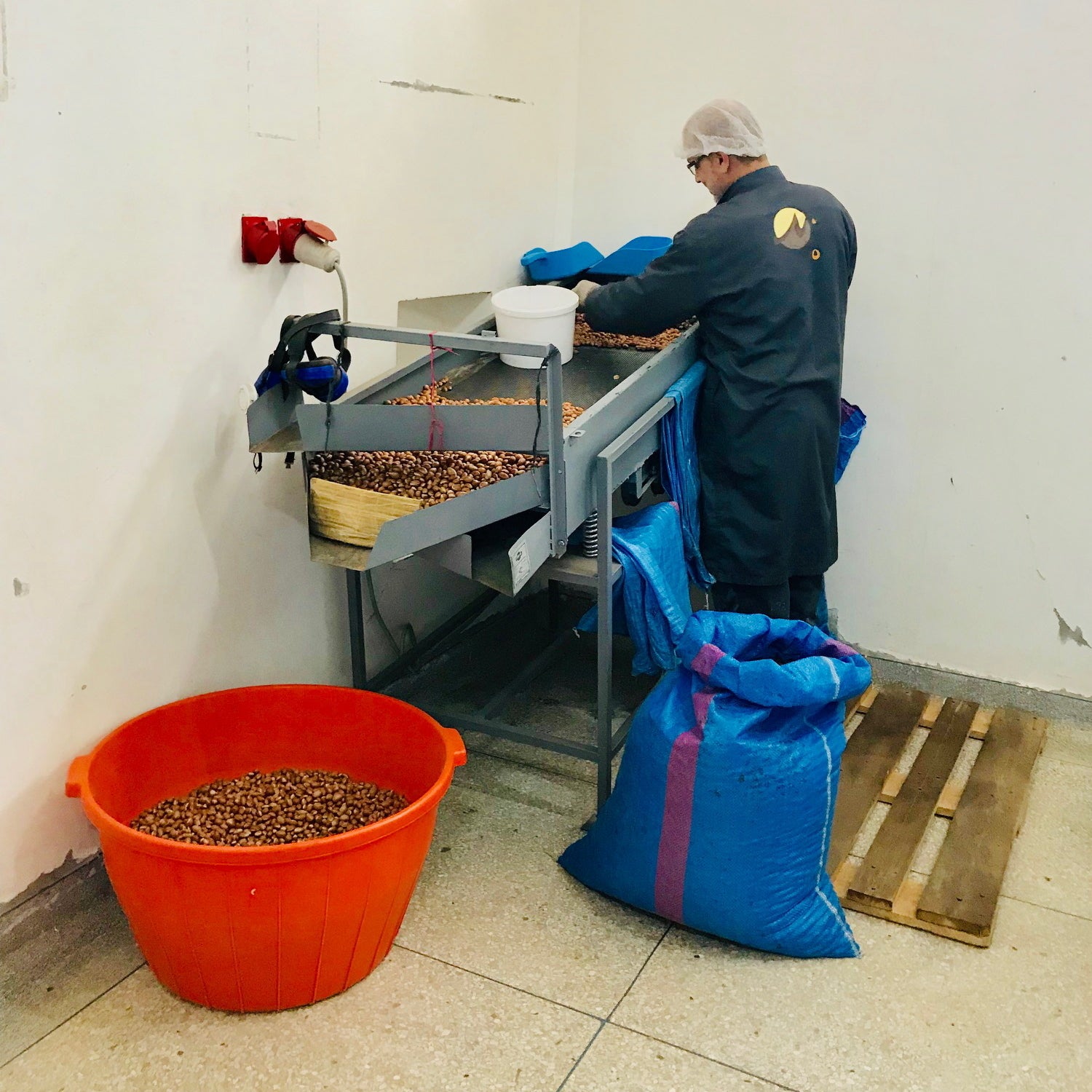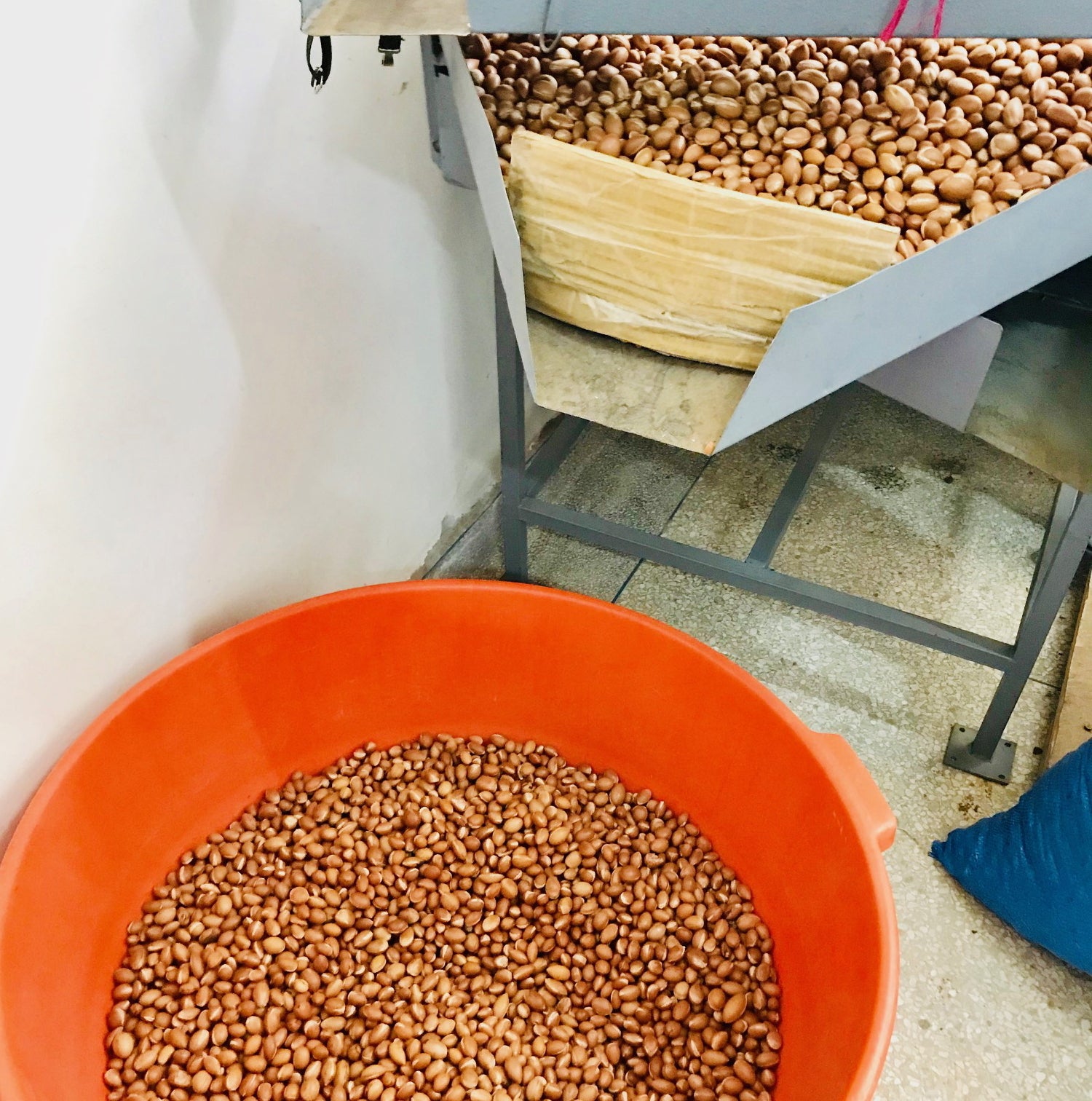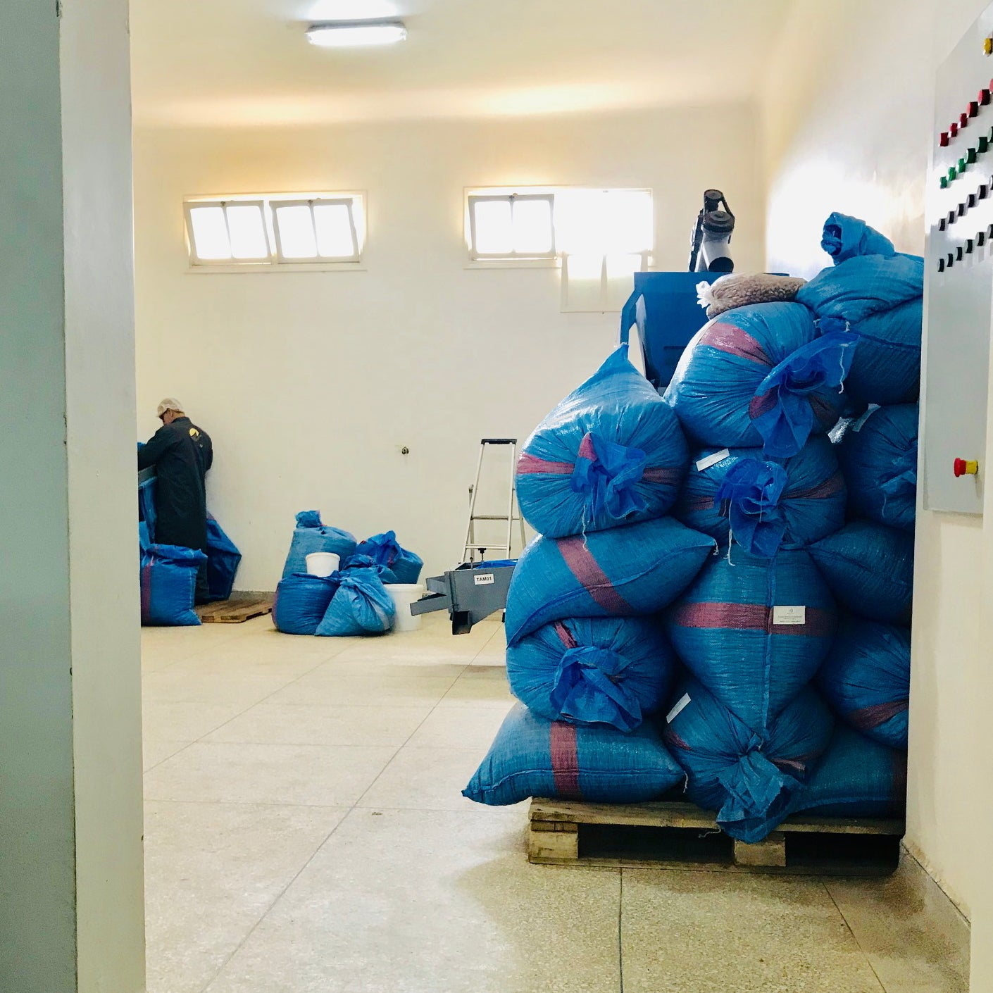 アルガンの樹々から取れたアルガンの果実を人が手作業で拾います。拾う時には一つ一つ選別し、袋詰めされてネクタロームの工場に到着します。