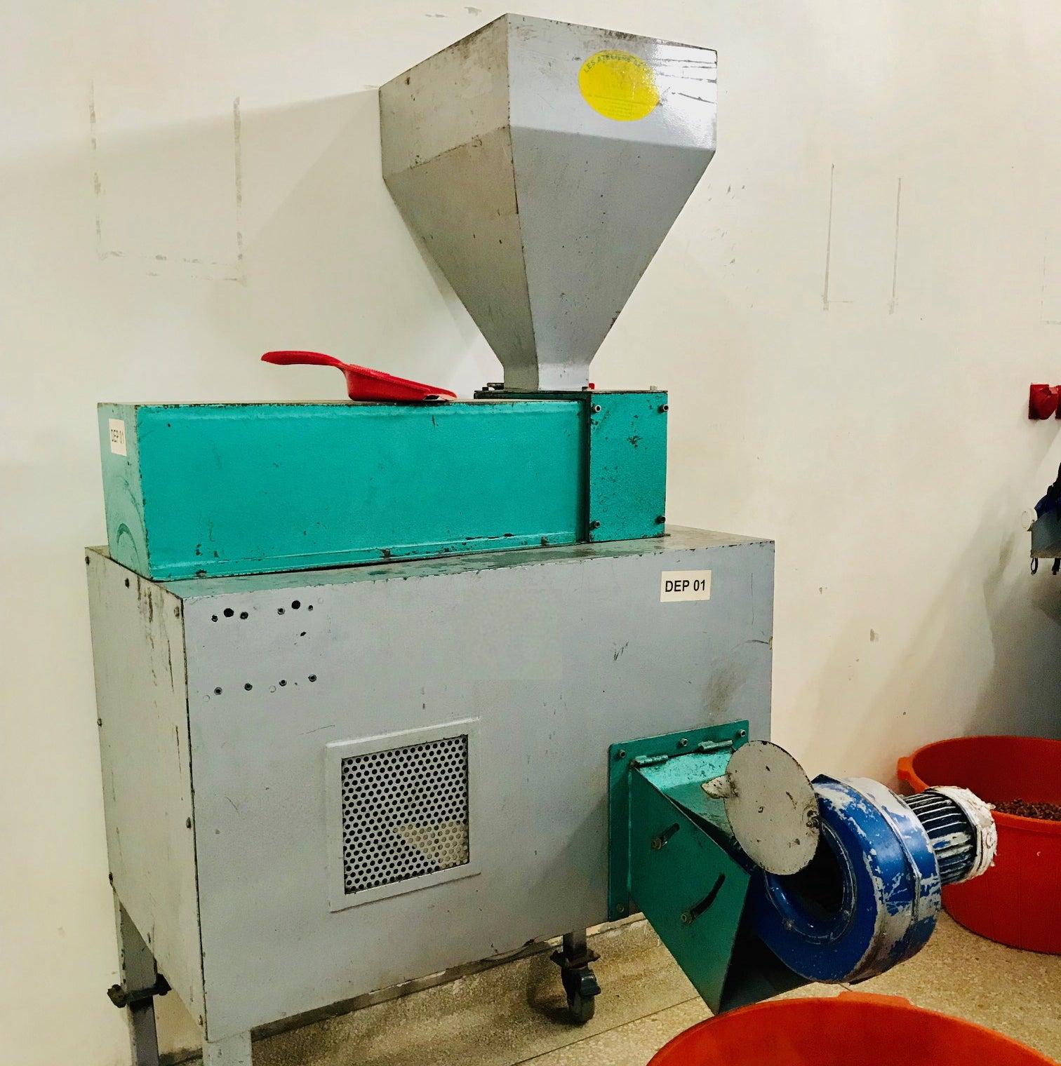圧砕機にかけられ取り出された実は、一つ一つ専門スタッフが目視しながら手作業で分別します。細かい作業ですが、品質を徹底的に管理するには、人による確認が必要不可欠です。こうして搾油される前の種の段階から、欠けているものを排除していきます。手作業になるので、スタッフは天然ゴム製の手袋をはめて作業します。