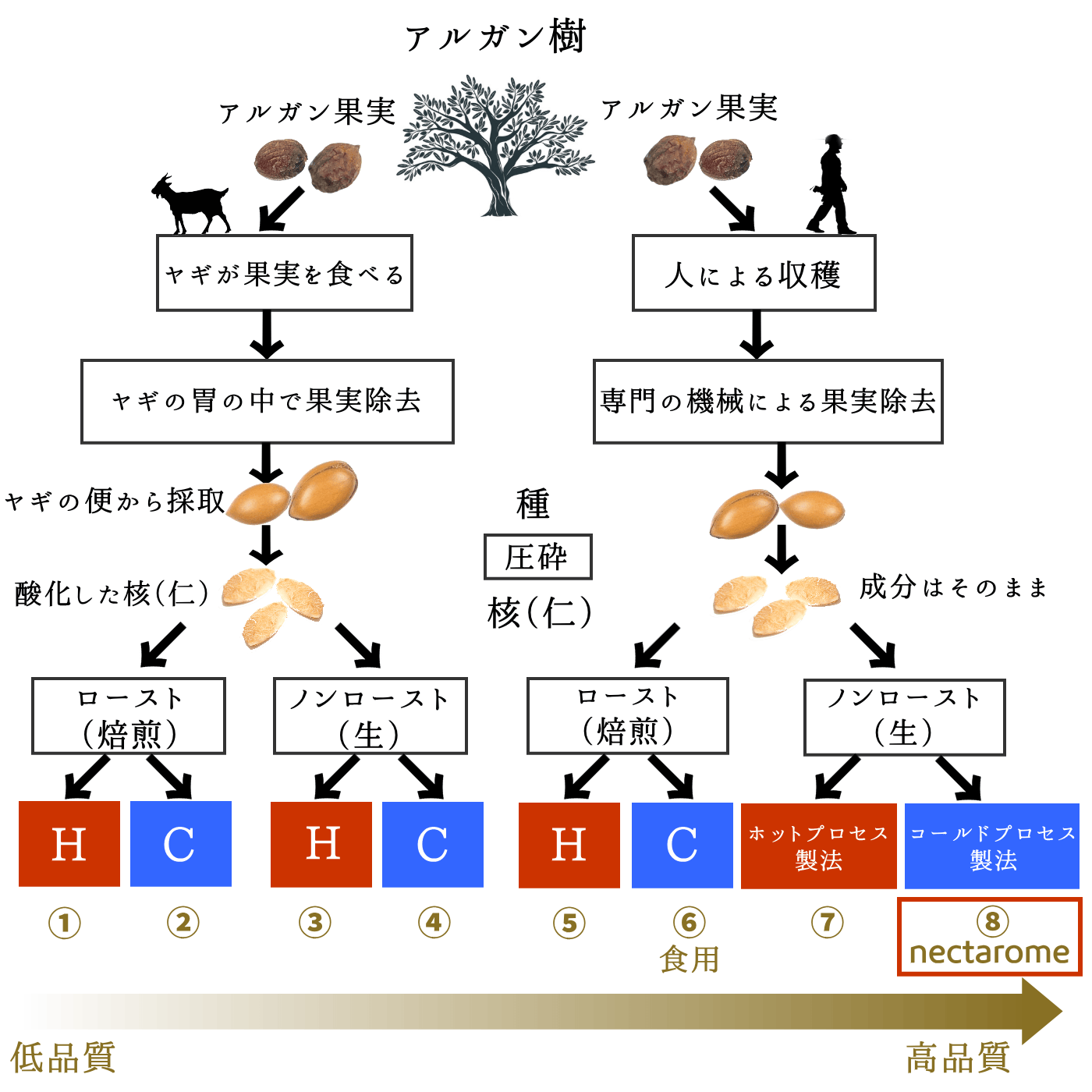 あまり知られていませんが、オリーブオイル等にもオイルの抽出方法などによって等級があるように、品質によるランク付けがされています。一般的に、お土産品などで安価で出回っているのは1~4のアルガンオイルとされています。中には、透明のボトルに入って酸化してしまった古いオイルもあります。
