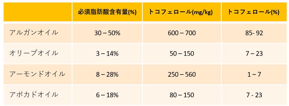 オリーブオイル、アーモンドオイル、その他の高品質オイルと比較して、アルガンオイルは天然合成物で必須脂肪酸とトコフェノールは、最も高い数字を示しています。アルガンオイルは、特に植物ステロールが豊富です。オレイン酸とリノール酸が80%以上の不飽和脂肪酸を含むアルガンオイルはとても貴重と言えます。