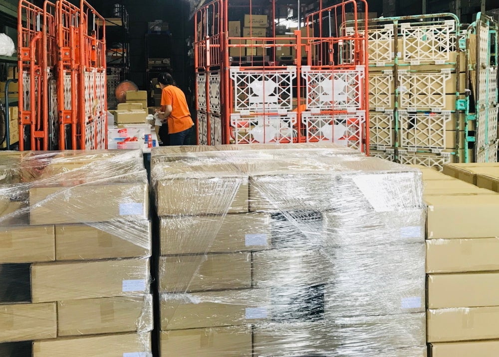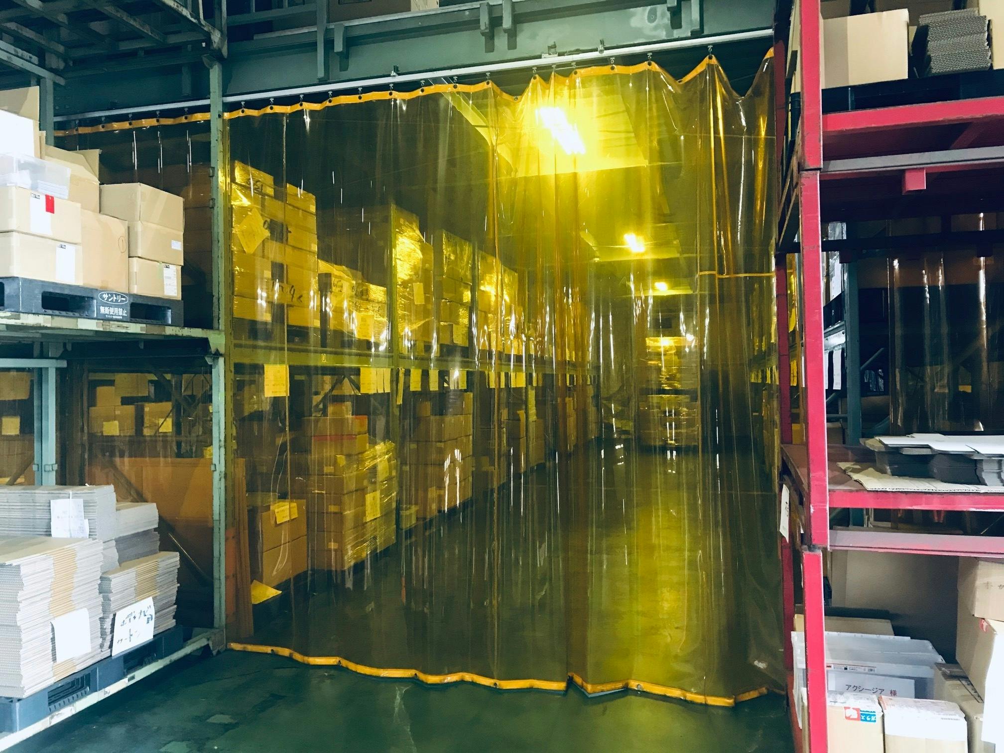 検品後、商品は倉庫へ送られ、保管されます。弊社の商品を保管している倉庫は、化粧品専用の倉庫で、常温を保てる場所に保管しています。通常のスペースと常温スペースはビニールのカーテンで区切られています。空調を切ることがないので、真夏でも品質を保つための保管が可能になっています。