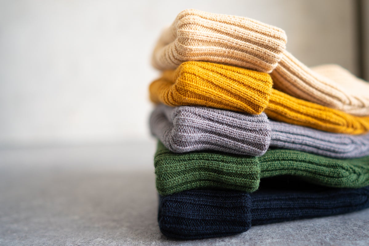リブが伸びやすいというコットンの特徴を補うために、丈夫なナイロンを少し混ぜて伸びにくく。