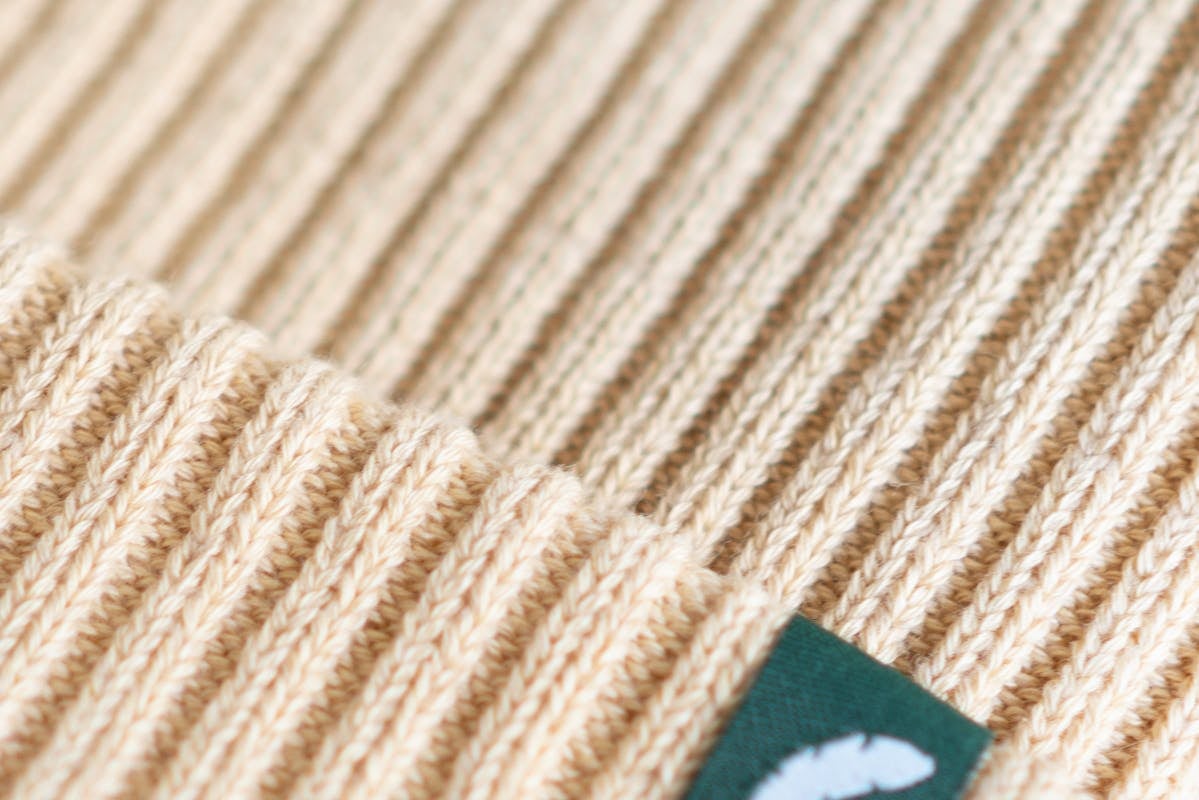 伸びてしまいやすい特徴をもつオーガニックコットンに、丈夫なナイロンと伸縮を助けるポリウレタンを少し混ぜることで、リブが伸びにくく、永くずっと使えるニットキャップが完成しました!
