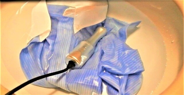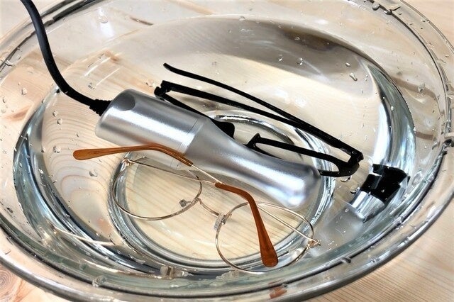 洗浄対象を水を入れた洗面器やシンクに浸けて、MegaSonicを起動させます。