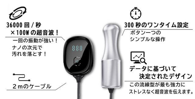 ①強力な超音波(36000回/秒 x 100W)でナノの次元の汚れを落とす