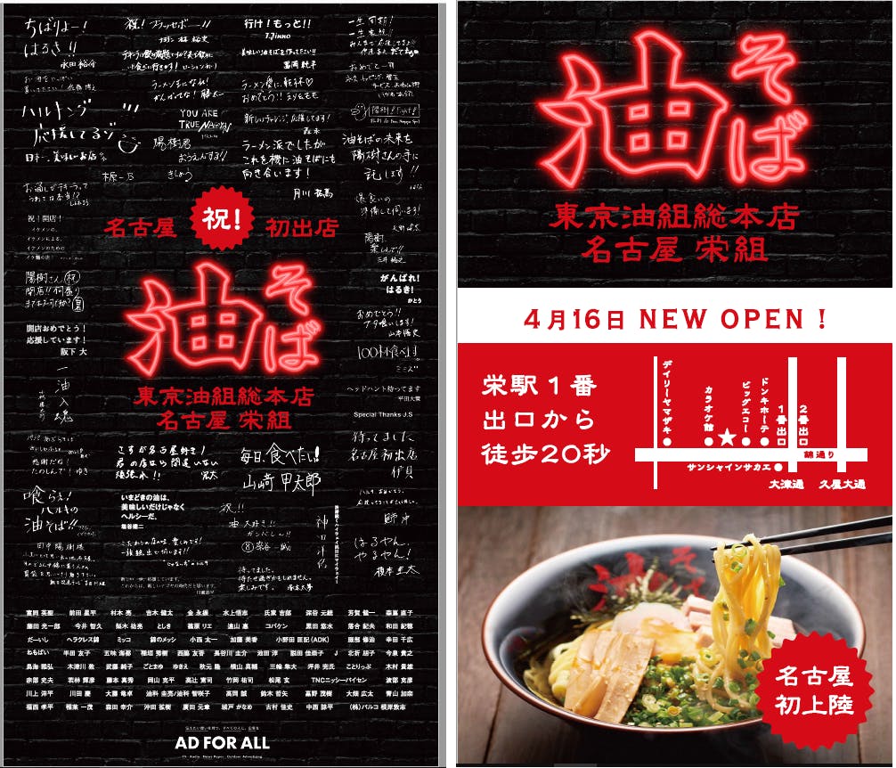 掲出先はお店の近辺である、栄エリアの看板(スペース)を予定しています。デザインは「AD FOR ALL」事務局さんと相談しながらですが、ご賛同頂いた皆さんのお名前を入れながらも店舗への集客に繋がるようなデザインにしていきたいと思っています。