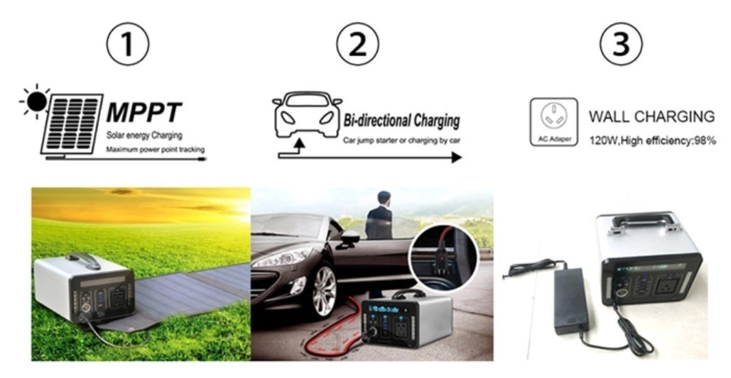 AC充電器、太陽光パネルを使った充電の他に車のシガーソケットからも充電可能。