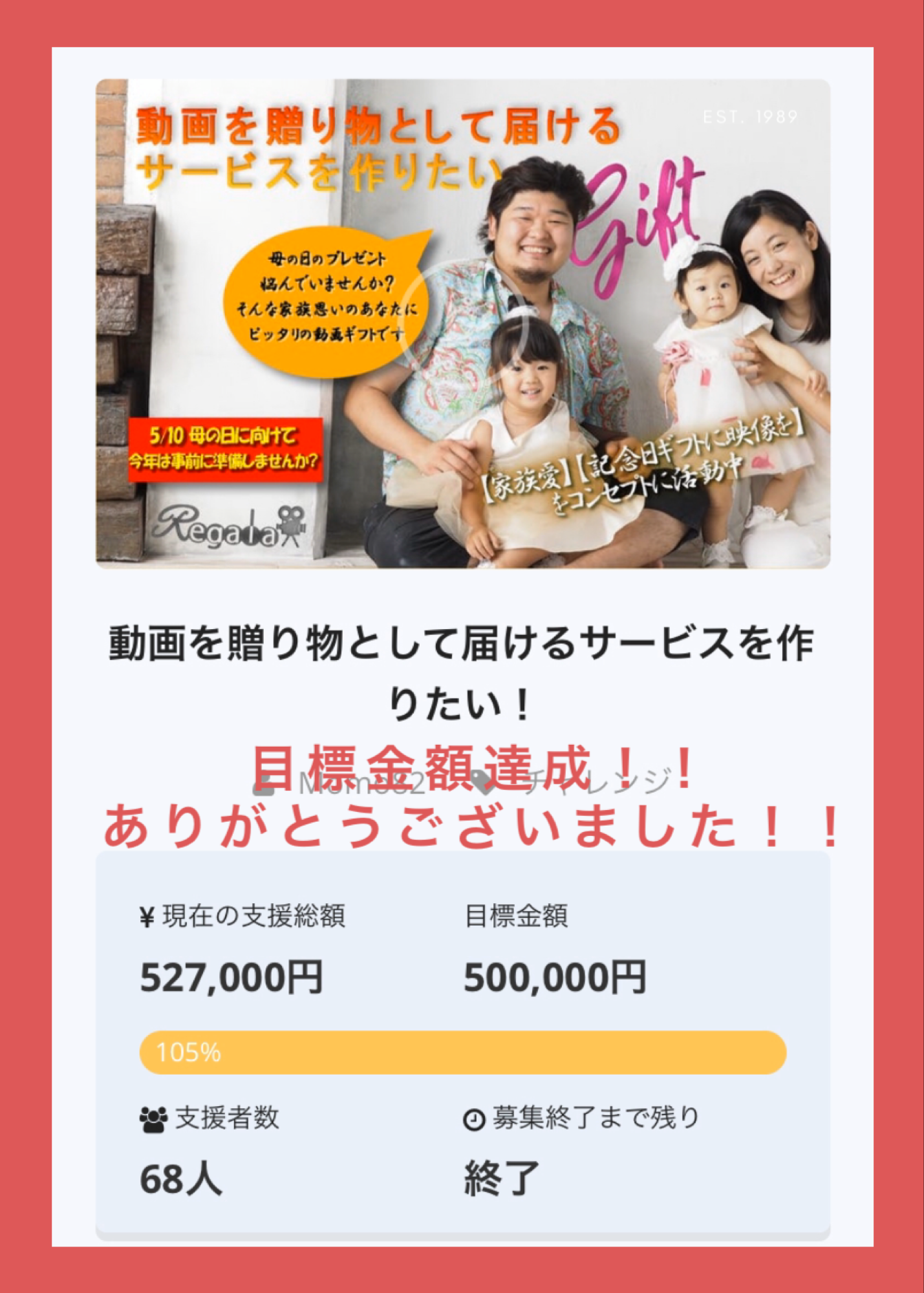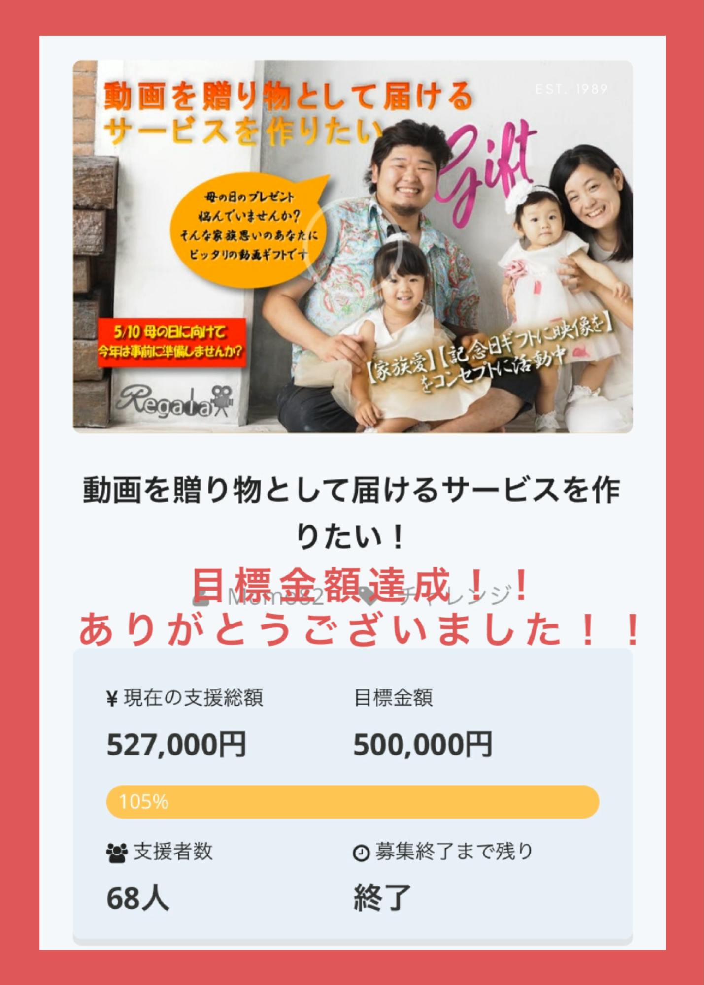 2020/04/19 11:34私たちの挑戦も、残るところあと2日となりました。皆さまからの温かいご支援をいただき、70%を達成させることができました。ありがとうございます。『動画ギフトサービスを多くの人に知ってほしい』という想いはもちろん支援してくださった方、その大切な方にしっかりと動画ギフトを届けたい。という思いが強くあります。そのため、本来ならば挑戦終了後に送らせていただく予定にしていました内容を『母の日に感謝を伝えるリターン』をご支援くださった方に事前に連絡させていただきます。ご多用かとは思いますが、一度目を通していただけると幸いです。また『母の日に感謝を伝えるリターン』としておりますが、結婚記念日、お誕生日、敬老の日などでの使用も可能です。変更される場合は合わせてご連絡いただきますよう宜しくお願い致します。 もっと見る