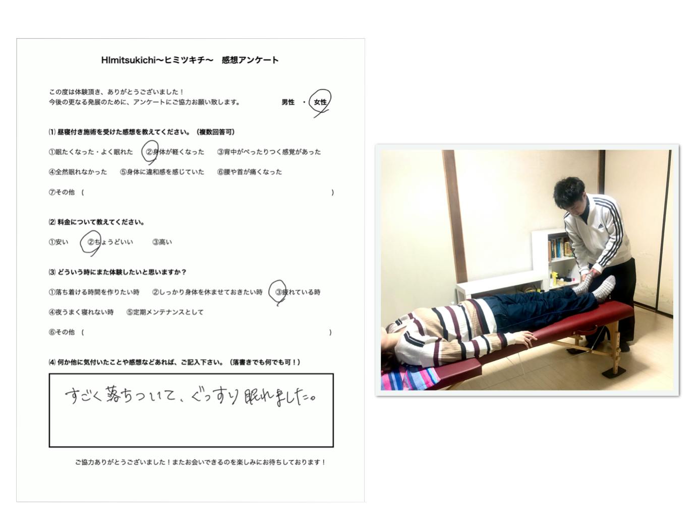 現在、お昼寝施術を体験して頂いておりますが、「眠たくなった」「身体が軽くなった」「背中がしっかりついている感じがある」などの変化を感じたとの感想を頂いております!