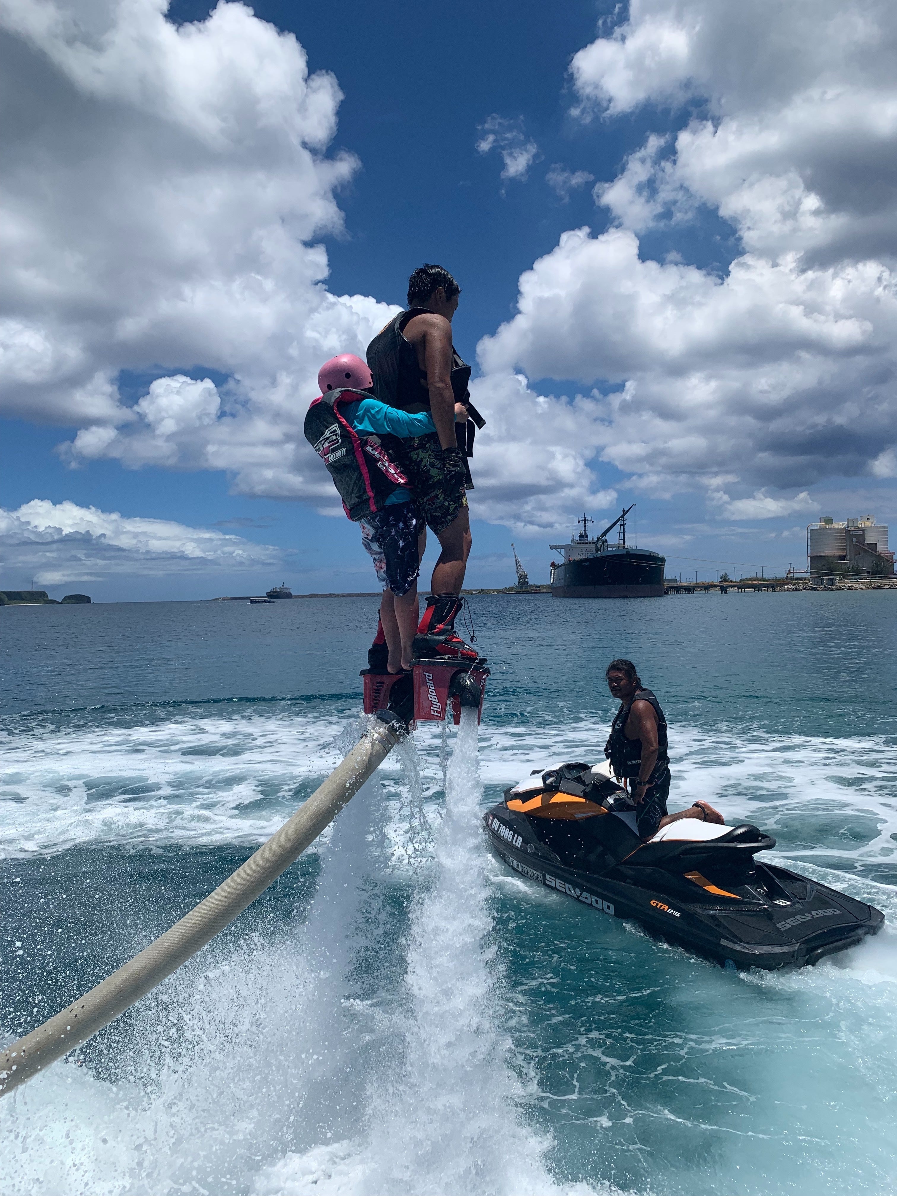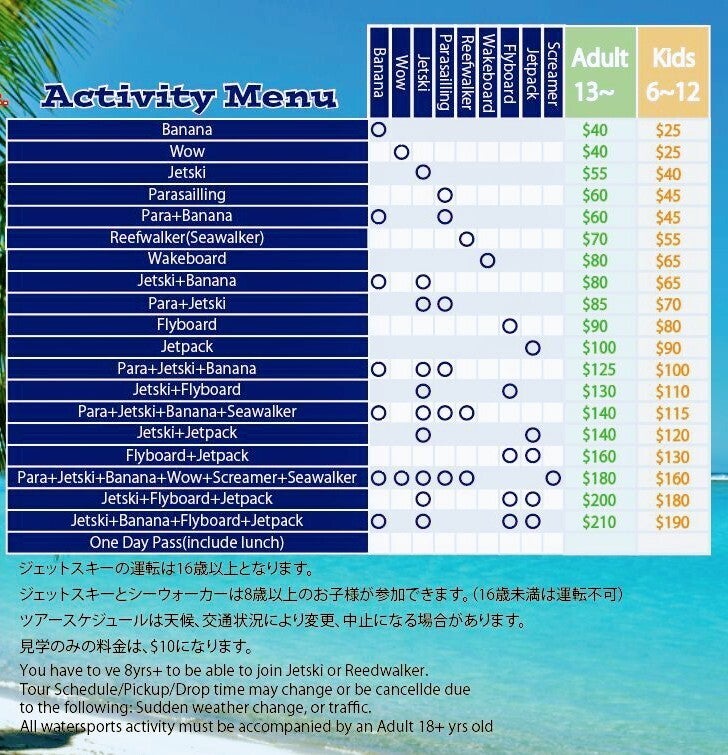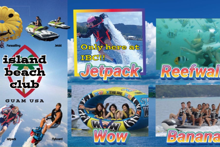 Island Beach Club Guam で使える、ホテルから当社ビーチまでの往復送迎+シュノーケルツアー+免許が無くても大丈夫!ジェットスキー40分レンタル+パラセーリング+(シーウォーカーor フライボードor ジェットパックor バナナボート)より2つ選択肢してください。+カヤック+SUP+浮き輪+水上アスレチックを1名様分。