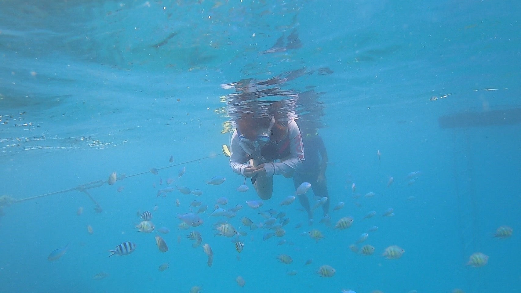 4月中旬白化しているサンゴの場所を特定、目印のブイを付ける作業。