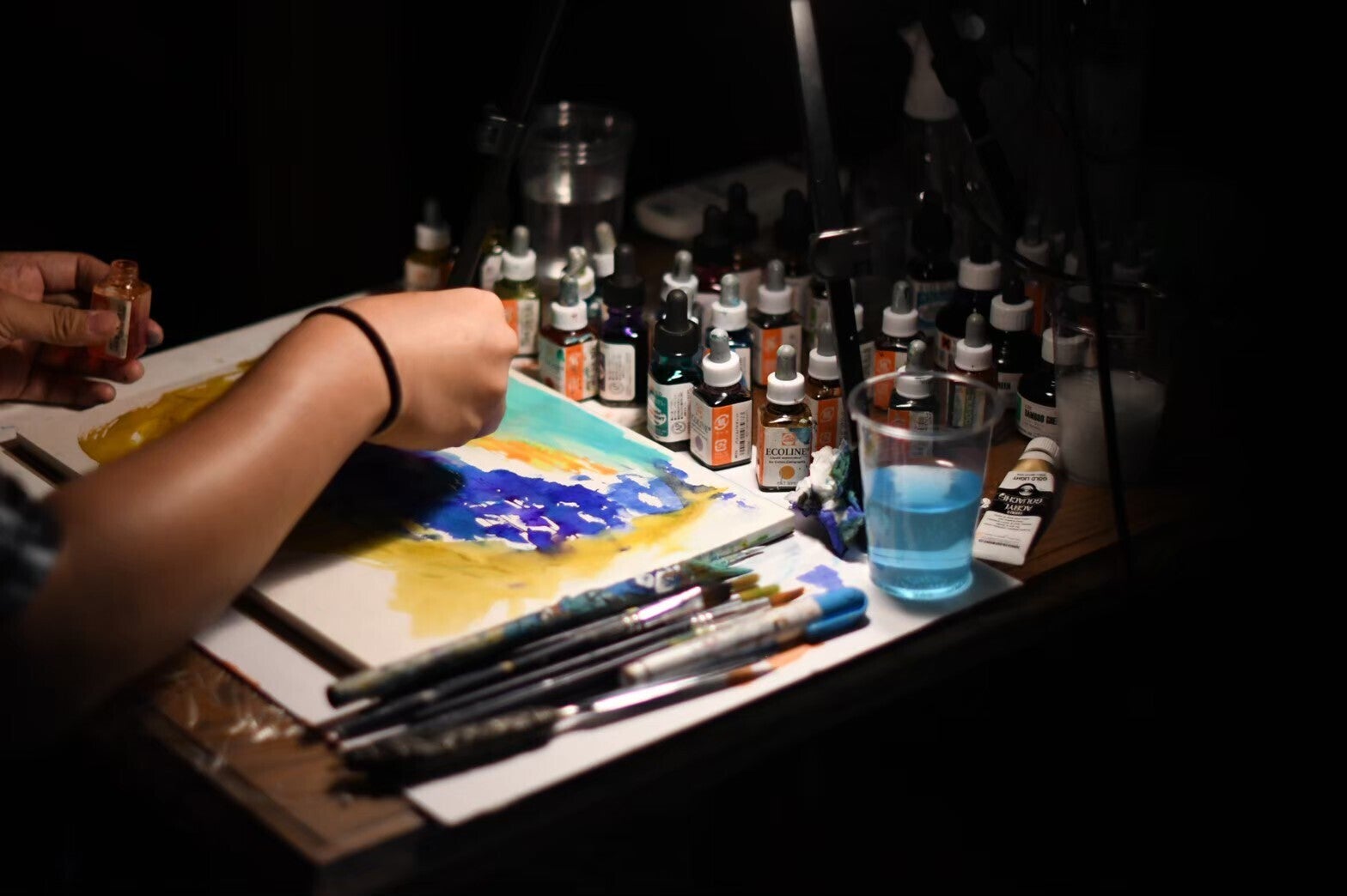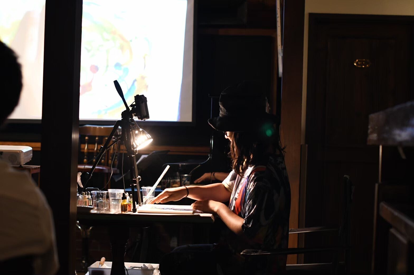※ライブドローイング…演奏に合わせて、その場でA4版程度の紙に水彩画を描いていき、その模様(手元)をカメラで捉え、スクリーンに映し出すパフォーマンスです。