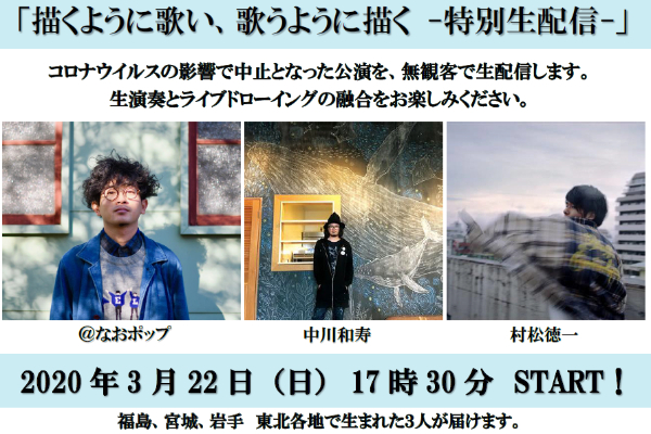 私@なおポップと、シンガーソングライター仲間の村松徳一、画家の中川和寿とともに、配信ライブを開催します。