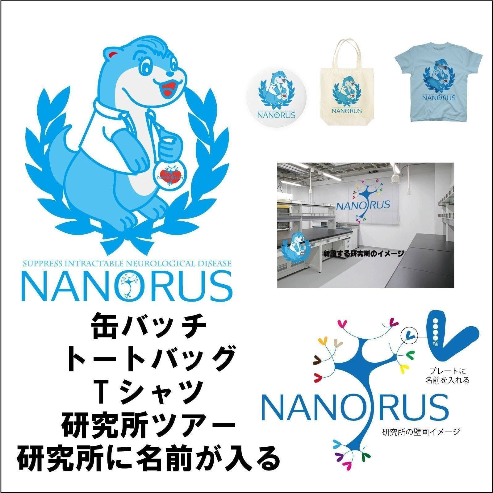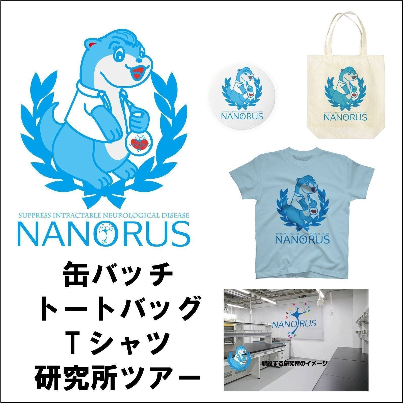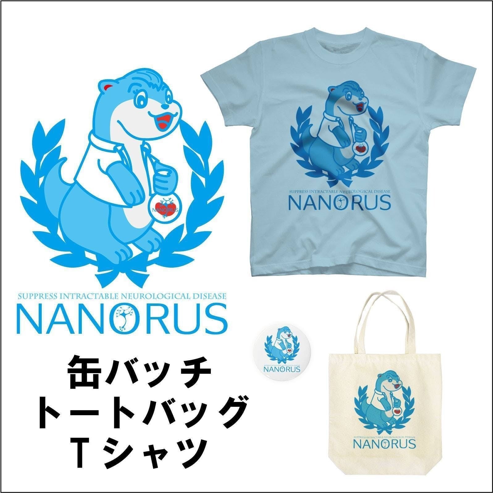 ※新たに設立した会社・ナノルスのロゴ・キャラクター入りの缶バッジ・トートバッグ・Tシャツです。