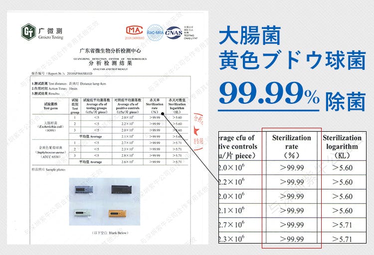 腸内細菌の大腸菌、黄色ブドウ球菌に対してUV-Cを照射。同じ試験を3回行いましたが、全ての結果で、99.99%以上の殺菌率を記録しました。