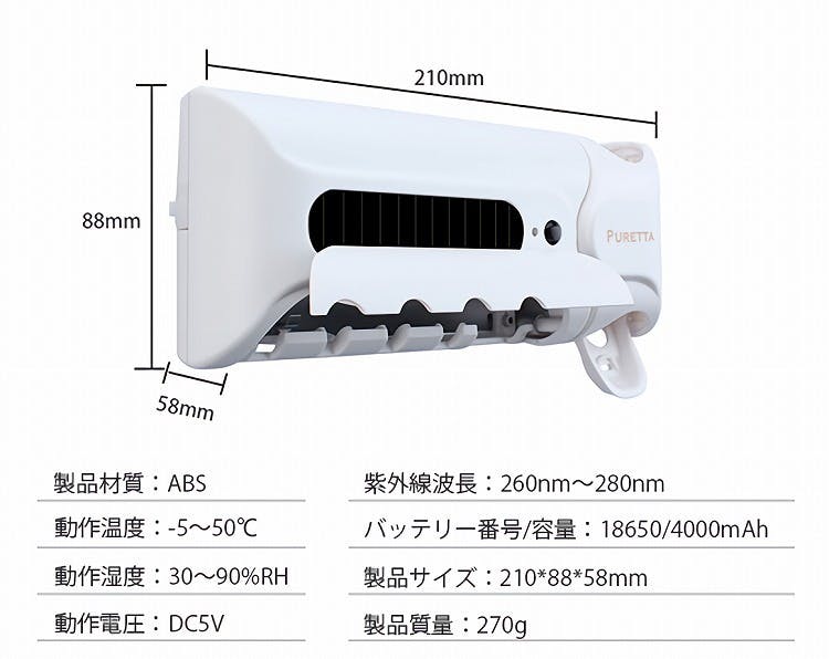 酸化チタンでコーティングされた「PURETTA」は、内部にブルーライトを30秒間照射することで、抗菌効果を発揮、ホルダー内部を常に清潔に保つことが可能です。