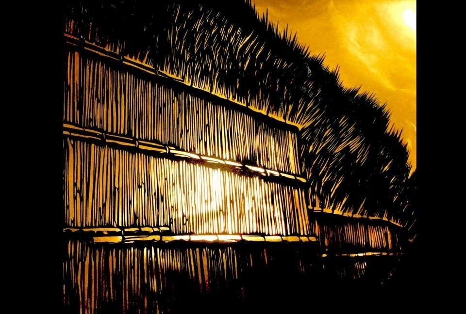これも切り絵なんですよー。黒いところが切り絵で、背景の夕焼けは金紙を当てています。