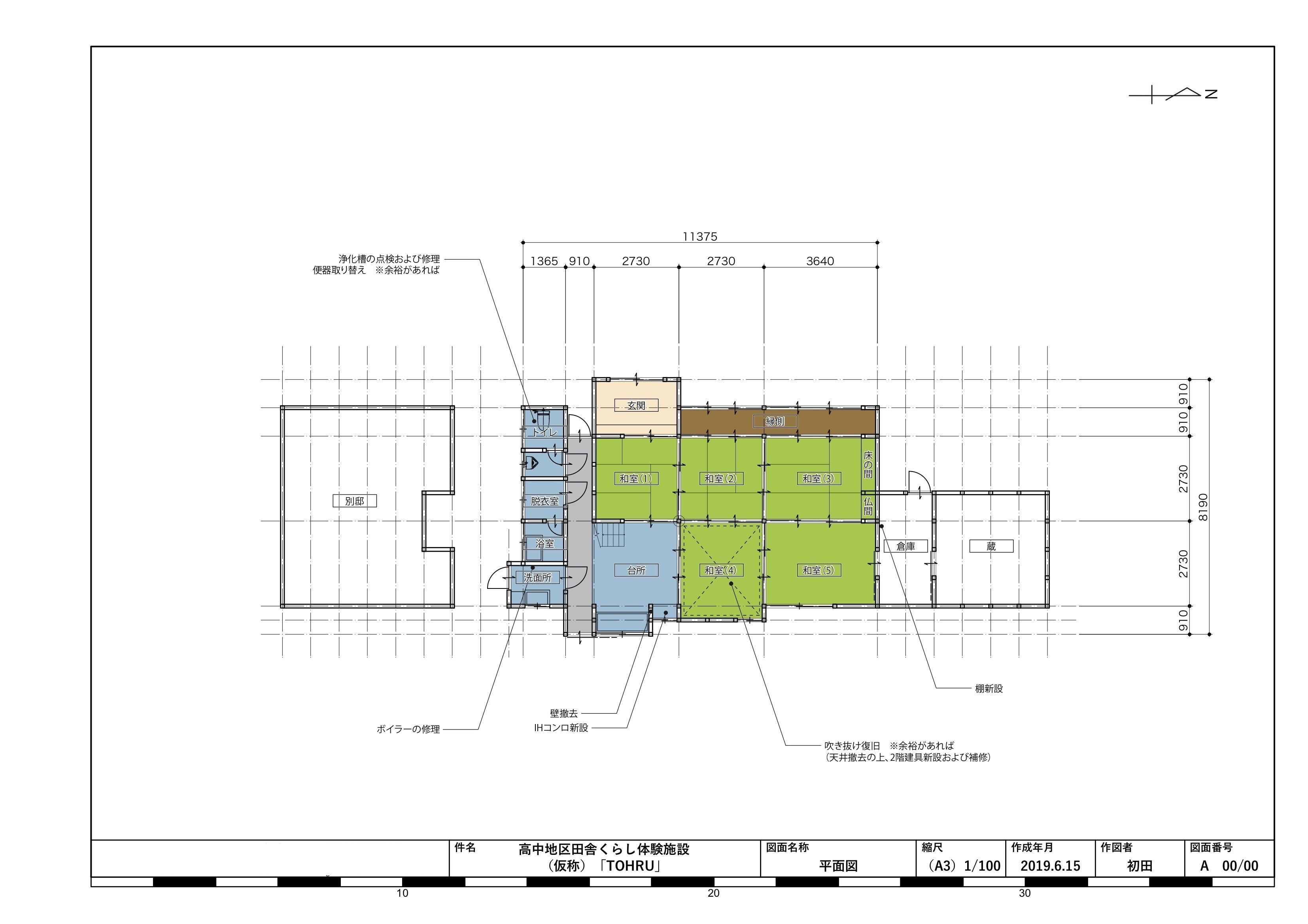 田舎暮らし体験施設の図面です。通り土間がある農家住宅ですが屋根裏ではカイコを飼っていました。キッチンや浴室などの水回りの改修と和室(4)の吹き抜けを復活させます。