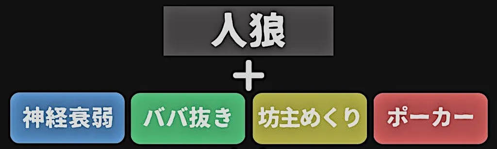 人狼という大きな題材に、神経衰弱、ババ抜き、坊主めくり、ポーカーなどの伝統的な遊びの要素を組み込んだゲームデザインとなっています。