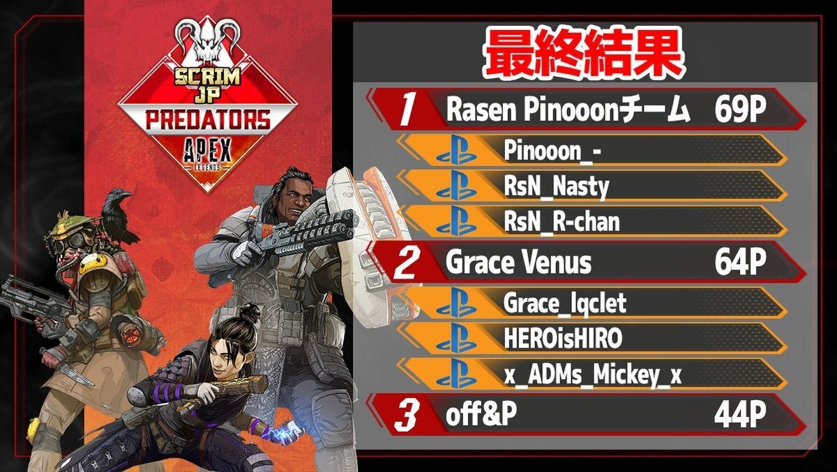 3/15開催日本のPS4版賞金付きスクリム主催の大会で3位に受賞しました。