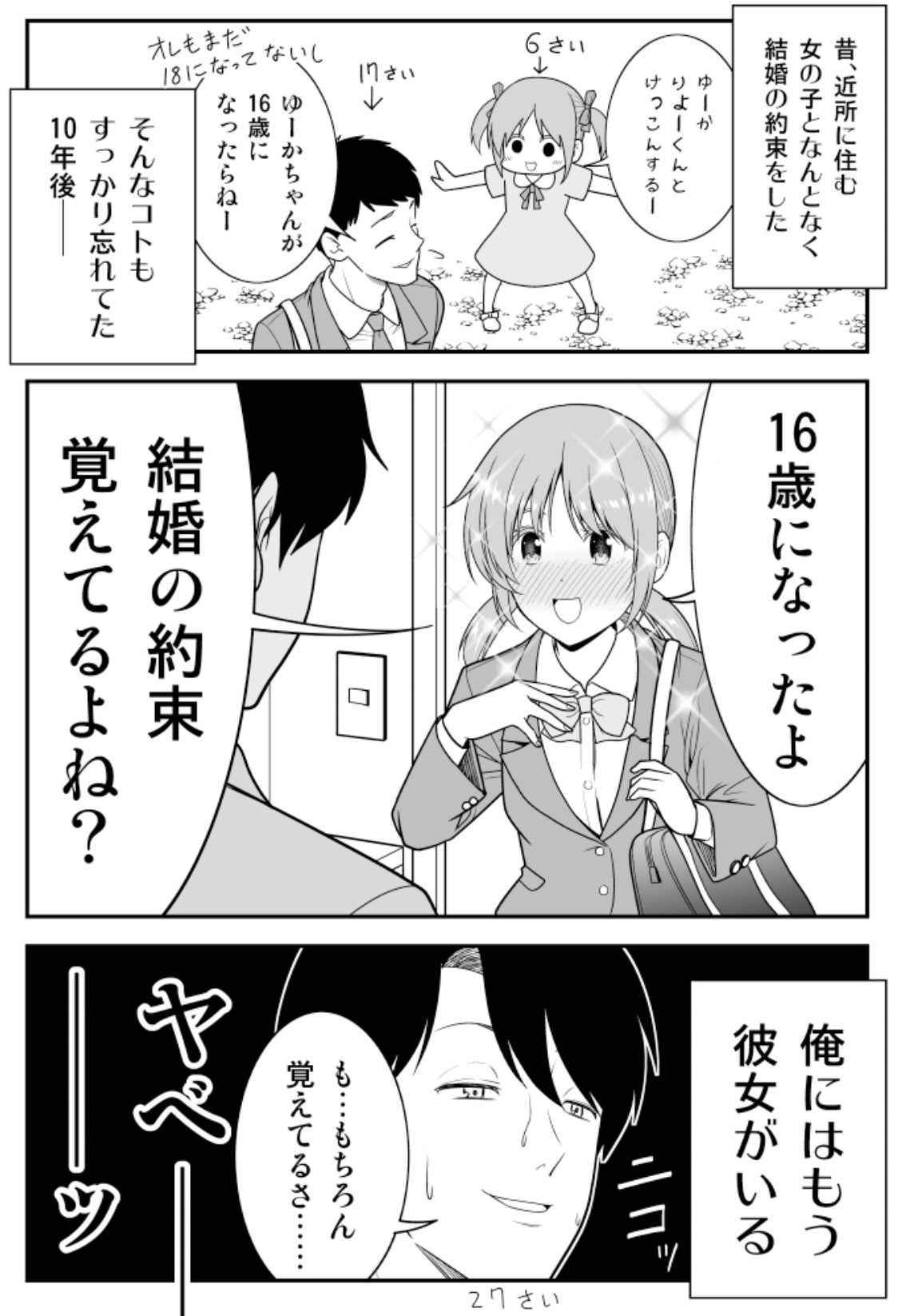 杉戸 亮…優香に好かれている亮。優香とは近所の幼馴染で6歳の頃に「16歳になったら結婚する」と言う約束をして忘れてしまっていた。すでに香澄という彼女がいて中々優香に言い出せないでいる。優香の良い子ぶりに日々苦戦しながら彼女がいることを言い出せないでいる。