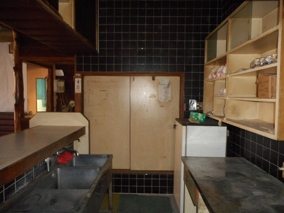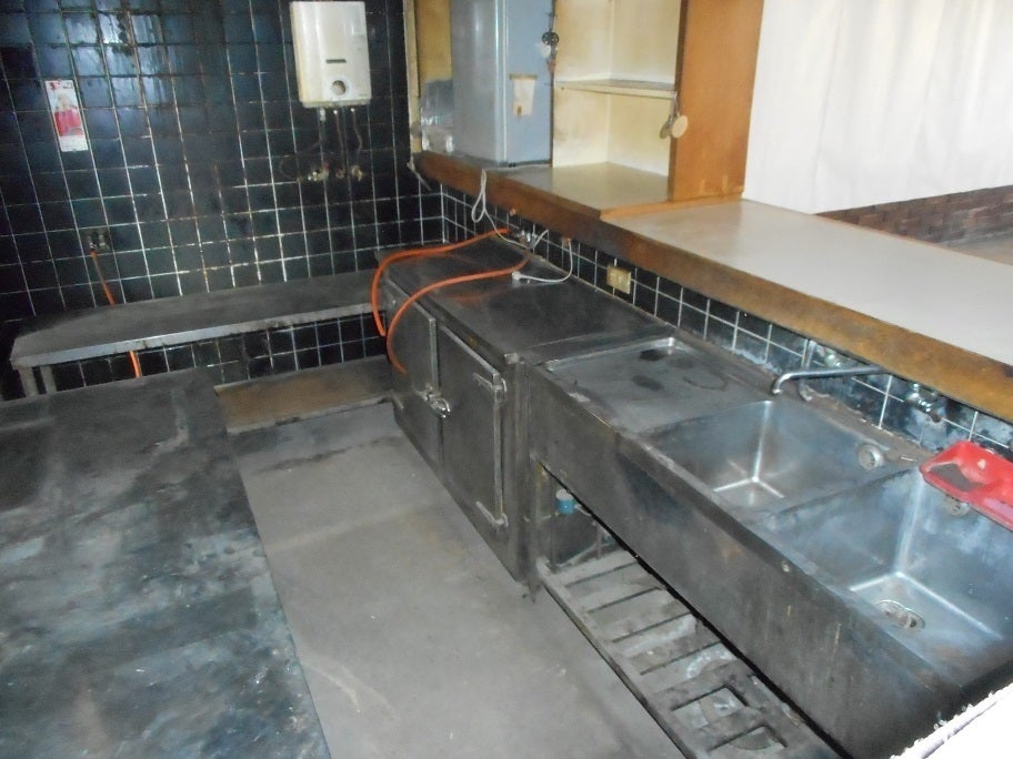 現在の厨房内の様子。まだ引越していないので、電気がきておらず、奥にある小さな2ドア式のコールドテーブルは使えるのか不明…可能ならば使います。