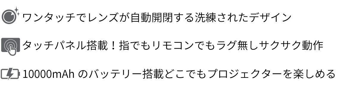 自宅はもちろん、旅行やキャンプなどにも気軽に持っていける大きさですので、いつでもどこでもプロジェクションをお楽しみいただければと思います。