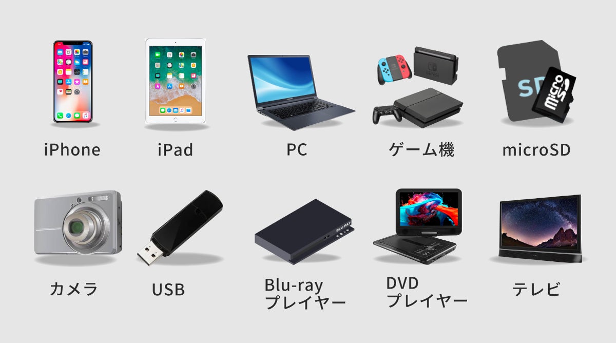 スマホ、PC、カメラ、ゲーム機、SD、 USB、Blu-rayプレイヤー、DVDプレイヤーなど