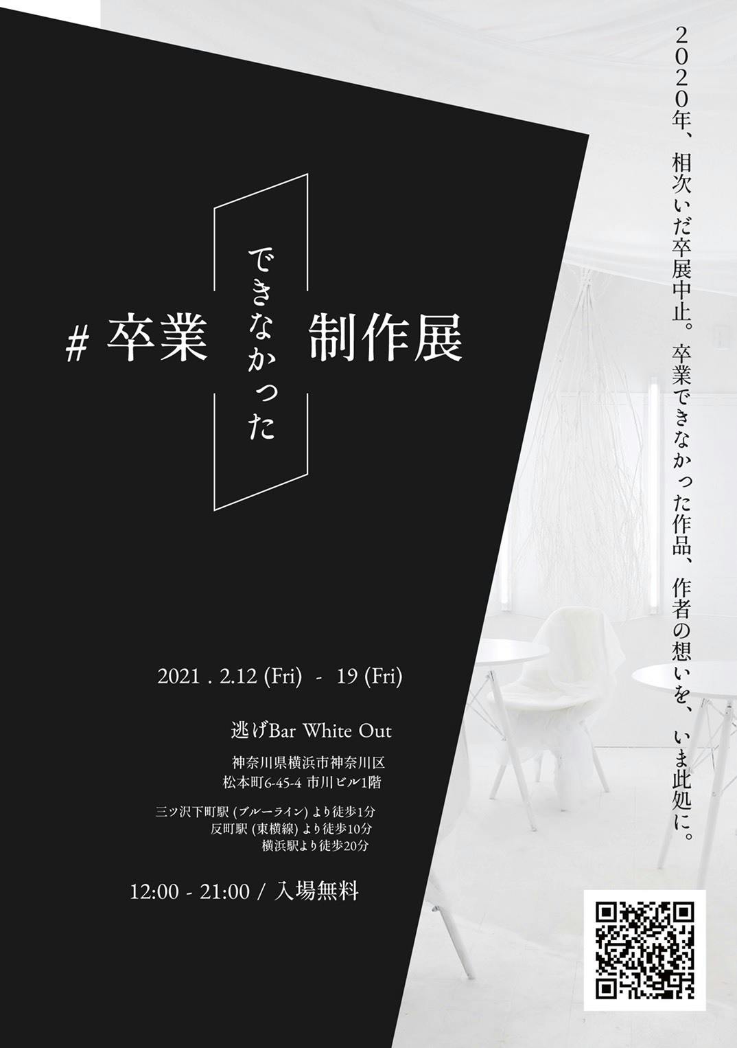 2021/02/11 14:44約1年越しの卒制展となってしまいました。いよいよ開催します「 #卒業できなかった制作展 」緊急事態宣言中ではありますが、店内入り口では体温検査を行いアルコール消毒をしていただき店内にも2カ所でアルコール消毒が可能です。また、密にならないようこちらより事前予約制にしてあります。できる限りの感染対策をしておりますので、ぜひ安心ご来場いただけますと幸いです。(もちろん体調が優れない方や不安が残る方はご無理なく、、、)開催期間:2021年2月12日〜19日展示時間:各日12:00~19:452/12.13 19:00~ ソウダルア(出張料理人)フードアートパフォーマンス2/14 19:00~ JIK×AKIE LIVE会場:逃げBar White Out神奈川県横浜市神奈川区松本町6-45-4 市川ビル1階https://www.nigebar.com/アクセス:三ツ沢下町駅(ブルーライン)松本町6丁目方面出口より徒歩1分反町駅(東横線)より徒歩10分横浜駅より徒歩20分・専用駐車場はございません。お近くのパーキングをご利用ください入場料:無料予約方法:こちらのページより事前予約・感染防止の会場内への人数制限のためご予約制とさせていただきます。・ご希望の日時、ご来場時間帯の無料チケットをご予約ください。・時間帯内であれば途中入退場は自由です。・必ず本ページ最下部の注意事項をご一読いただいてからご予約ください。最大同時入場者数:15名 もっと見る