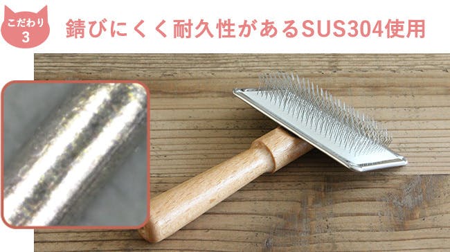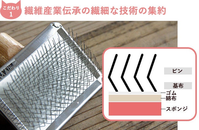 ブラシ部分は綿布にゴムを貼り付けた「基布」に金属ワイヤーを植え込んだ「針布」と言うものが使用されています。「針布」は元来繊維産業で繊維を櫛とき不純物を除去し繊維の方向性をそろえる整毛や、フリースや毛布などの高級織物をふわっとやわらかい風合いに仕上げる起毛に使われています。良質の「針布」を製造するには繊細かつ高度な技術が必要です。その繊維産業の精密加工技術を集約したのがスリッカーブラシ ラウンドトップピンです。