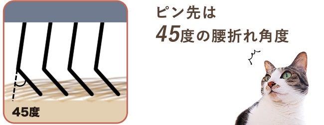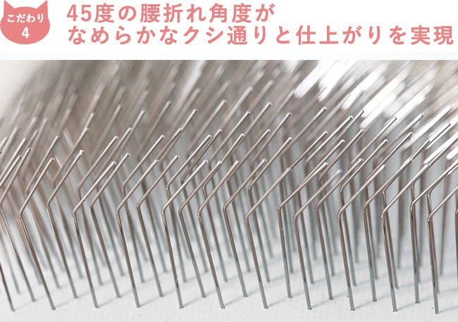 45度の腰折れの角度がなめらかなクシ通りと仕上がりを実現します。絡んだ毛玉やクセ毛にピン先が入り込んで梳る(くしけずる)ためには、深い角度(45度以上)で一定していることが重要です。45度以上ないとピン先が毛の間に入り込みません。ピンの横腹で引っ掛けて引っ張ることになります。