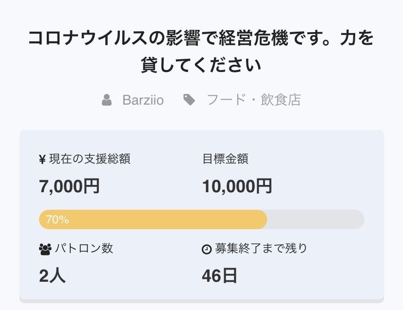 2020/03/17 09:00こんにちは。Barziioです。クラウドファンディングを始めて3日経ちました。コロナウイルスの蔓延により、世界中で感染の被害が出て日本全国でも罹患者が確認され、他人事ではなくなってきた頃には、もう私にはこれからの希望が全く持てず、1週間後...いや、明日にはもう見切りをつけるしか無いと諦めのような気持ちで毎日を過ごしていたと思います。「Instagram見てきたよ。大変なんだってね」「クラウドファンディングで初めて知って来店しました。頑張ってください」「続けて頂けるよう、応援しています」本当に皆様温かく、優しく、実際に来店を頂いたりコメントを頂いたり、支援を頂いたり...この3日間で私の気持ちはこれまでと正反対の希望に満ち溢れたものになっています。本当の本当にありがとうございます。必ずこのピンチをチャンスに変えて乗り越え、また来店いただく皆様、これから初めて来店いただく皆様を元気いっぱい笑顔で迎えられるよう、全力で頑張ります!まだまだ先が全く見えない状況ではございますので、誠に勝手ながら引き続き応援、ご支援よろしくお願い申し上げます!最後に、罹患された方が早期に回復されることと、亡くなられた方のご冥福を心よりお祈り申し上げます。早く事態が終息する事を心から祈ります。 もっと見る