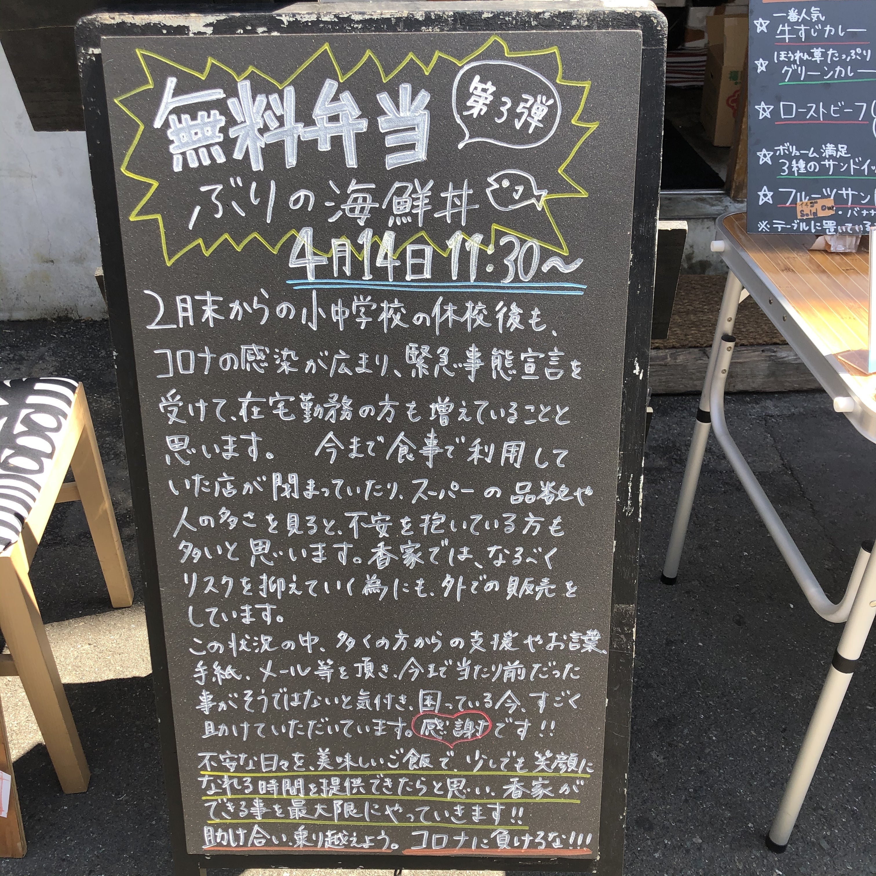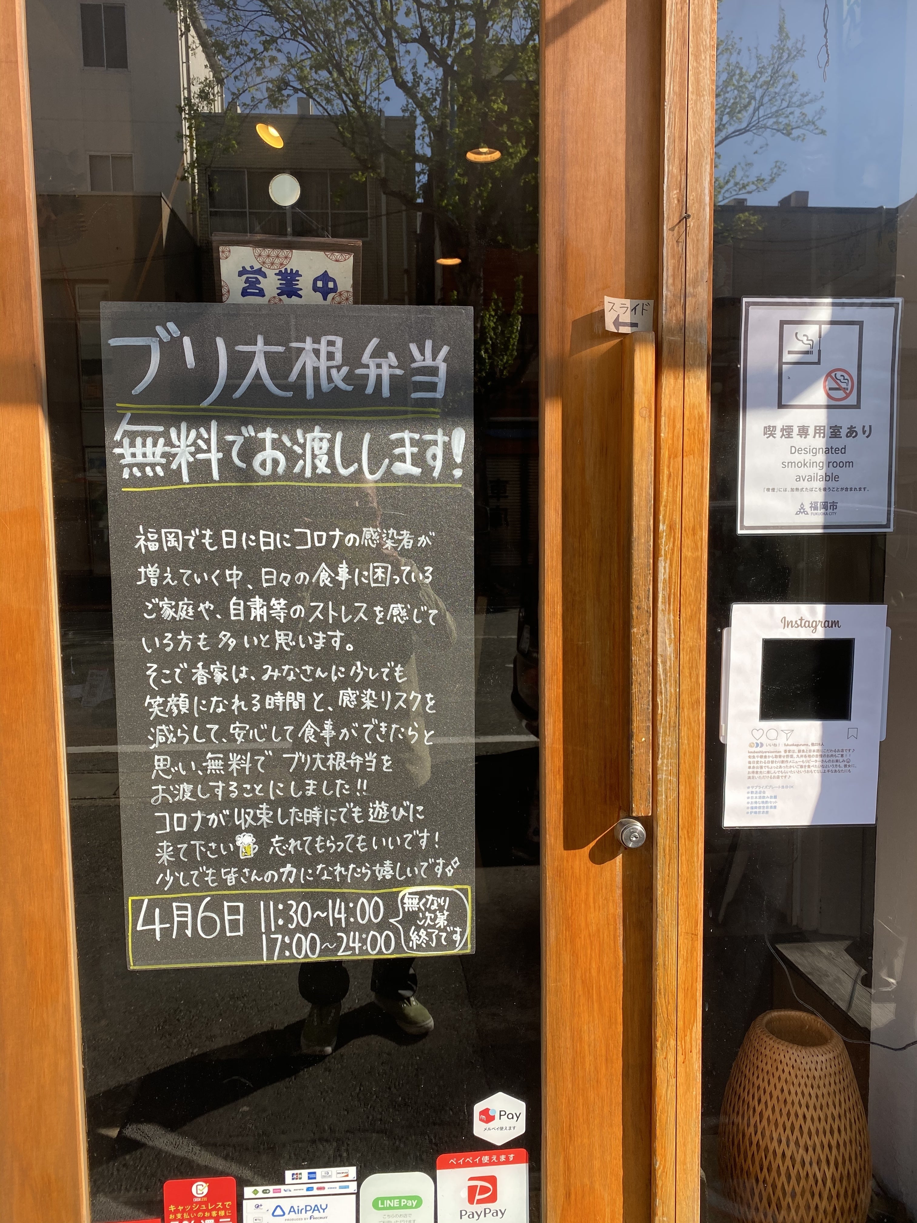 2020/04/17 17:18ぶりの海鮮丼を無料でお渡しいたしました!3日間で約350食お渡しできました!!市場の方からのご協力をいただき、安価で仕入れることができたため、実現できました!休校中のご家庭の方、在宅勤務をされている方、リスクを抱えながら仕事をしている方…みなさんに、食を通して、笑顔になれる時間を提供できたらと思い、今回が3回目の無料弁当のお渡しでした。エールを、と思いはじめましたが、お客様からの応援のお言葉や差し入れ等もいただき、こちらがパワーをいただきました。ありがとうございます!!今後もいまの状況のなかでも、香家から届ける食を通して、喜んでいただけることを企画していきたいと思います! もっと見る