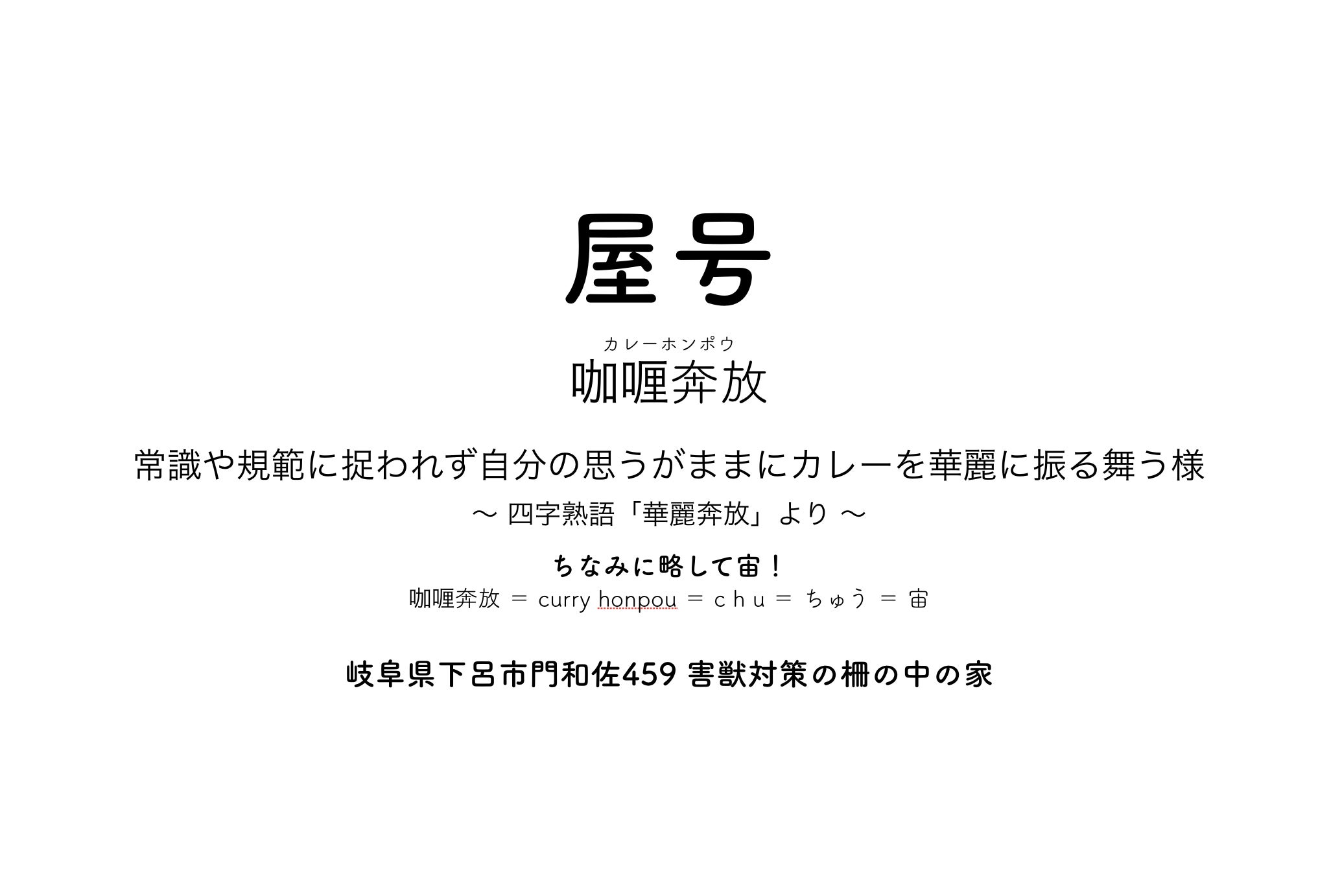 今現在、岐阜県下呂市上原という山の中の古民家を『咖喱奔放』という名の飲食店、総菜屋オープンへ向け日々改修工事中、2020年6月中旬プレオープン、10月ガチオープン。
