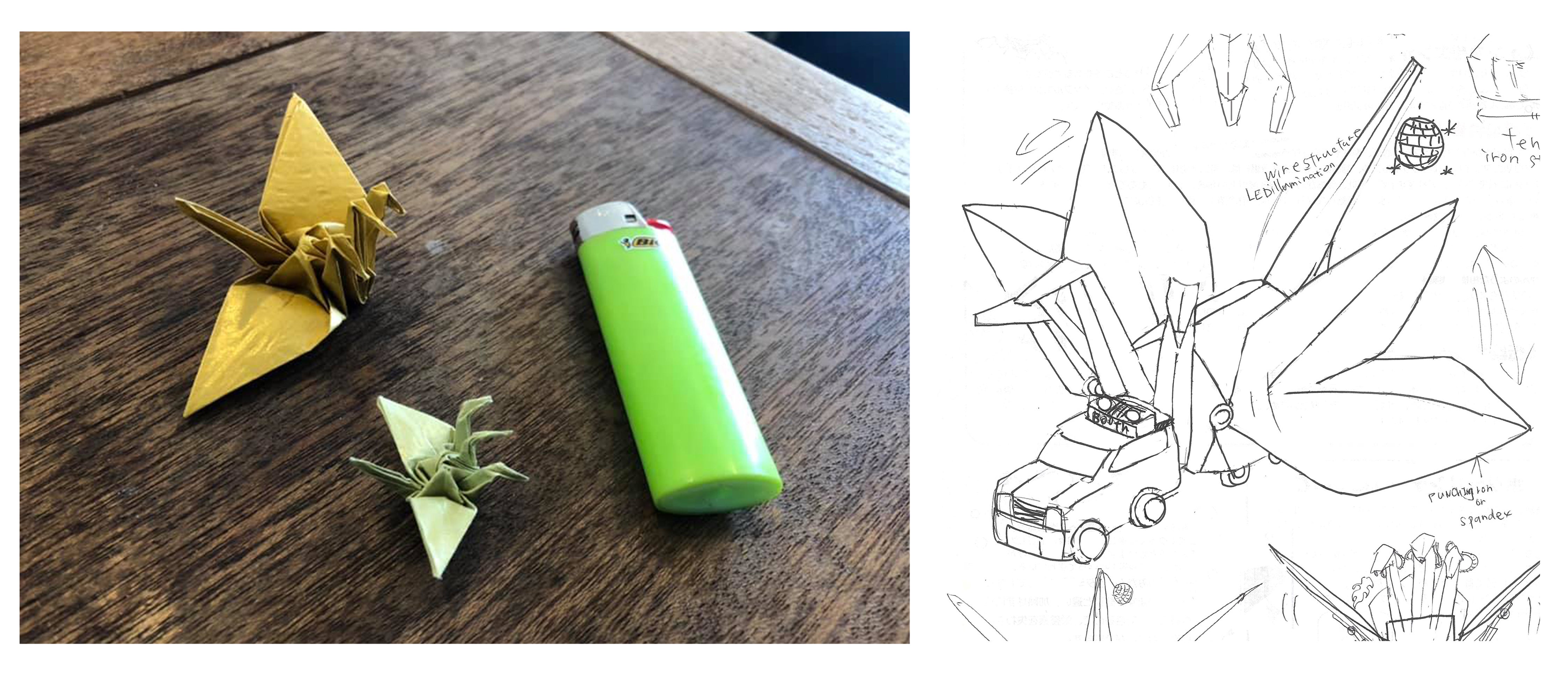 左:造形とコンセプトのヒントになった三つ頭の折り鶴