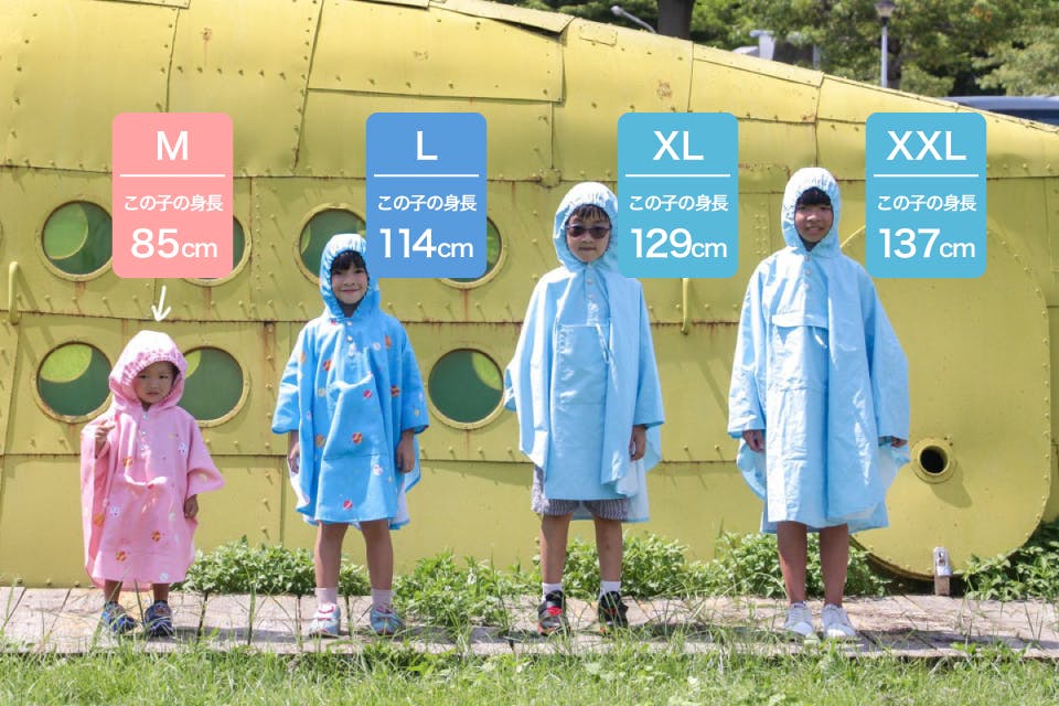 写真の子供は身長137cmで、リュックを背負うのでXXLをおすすめします。